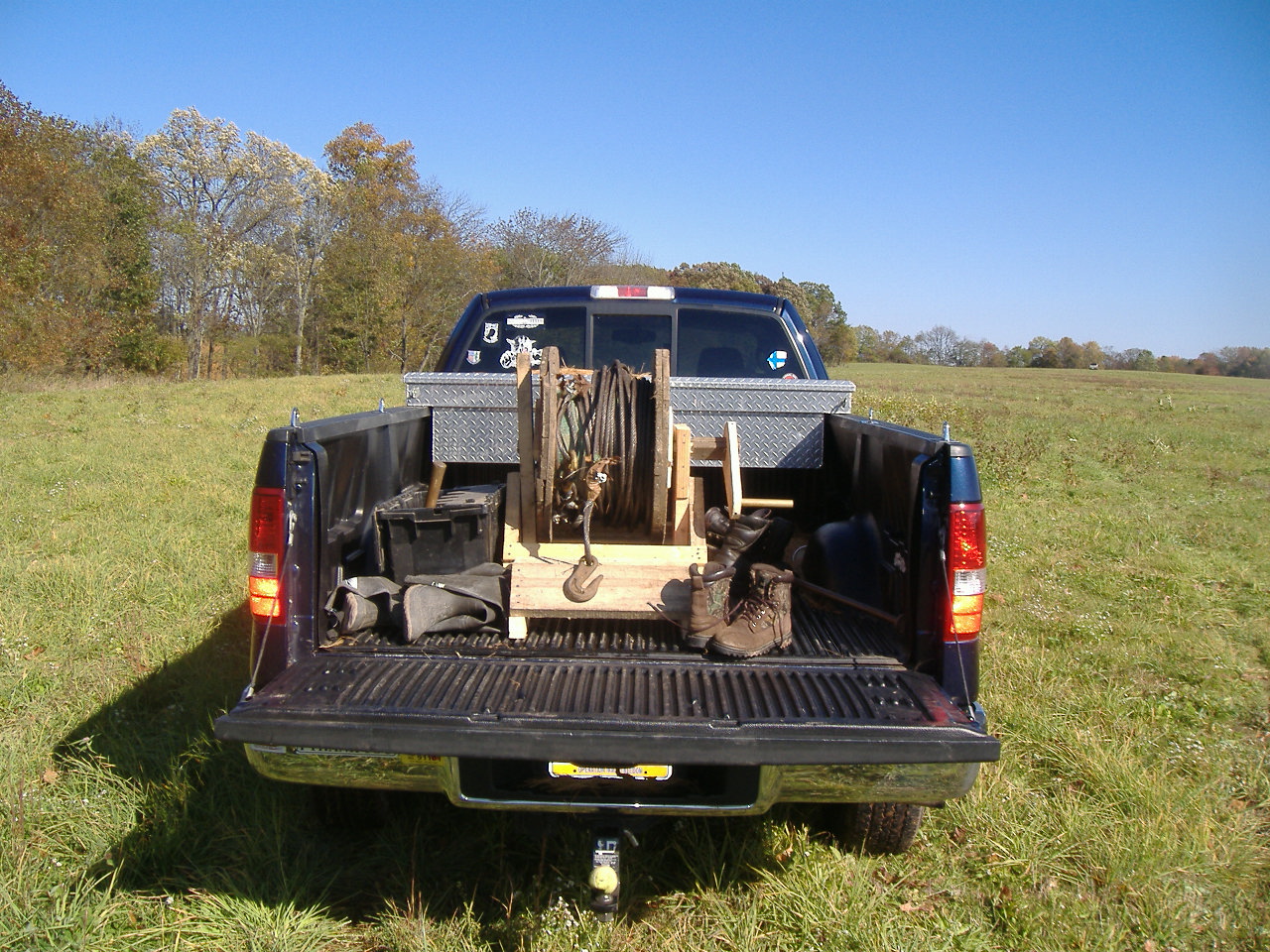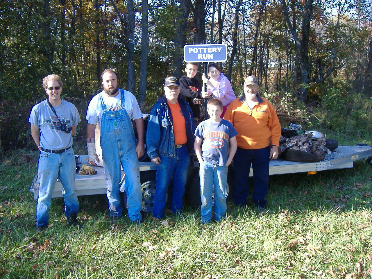 Photo 2008-03A; Pottery Run cleanup crew, front: Dale Reed, Joe Gallagher, Roy Lehto, Toby Gallagher, Jim Gallagher. Rear: Eric and Emily Hemler. Photo 2008-03B; Eric Hemler at Pottery Run sign. Photo 2008-03C; At the time of cleanup Joe Gallagher worked as a rigger for Hulcher Services. (Hulcher routinely sets derailed trains back on their tracks.) It was primarily through Joe's skills and guidance refrigerators and stoves were successfully moved hundreds of feet from the stream bed, through standing trees and brush, to the trash truck.