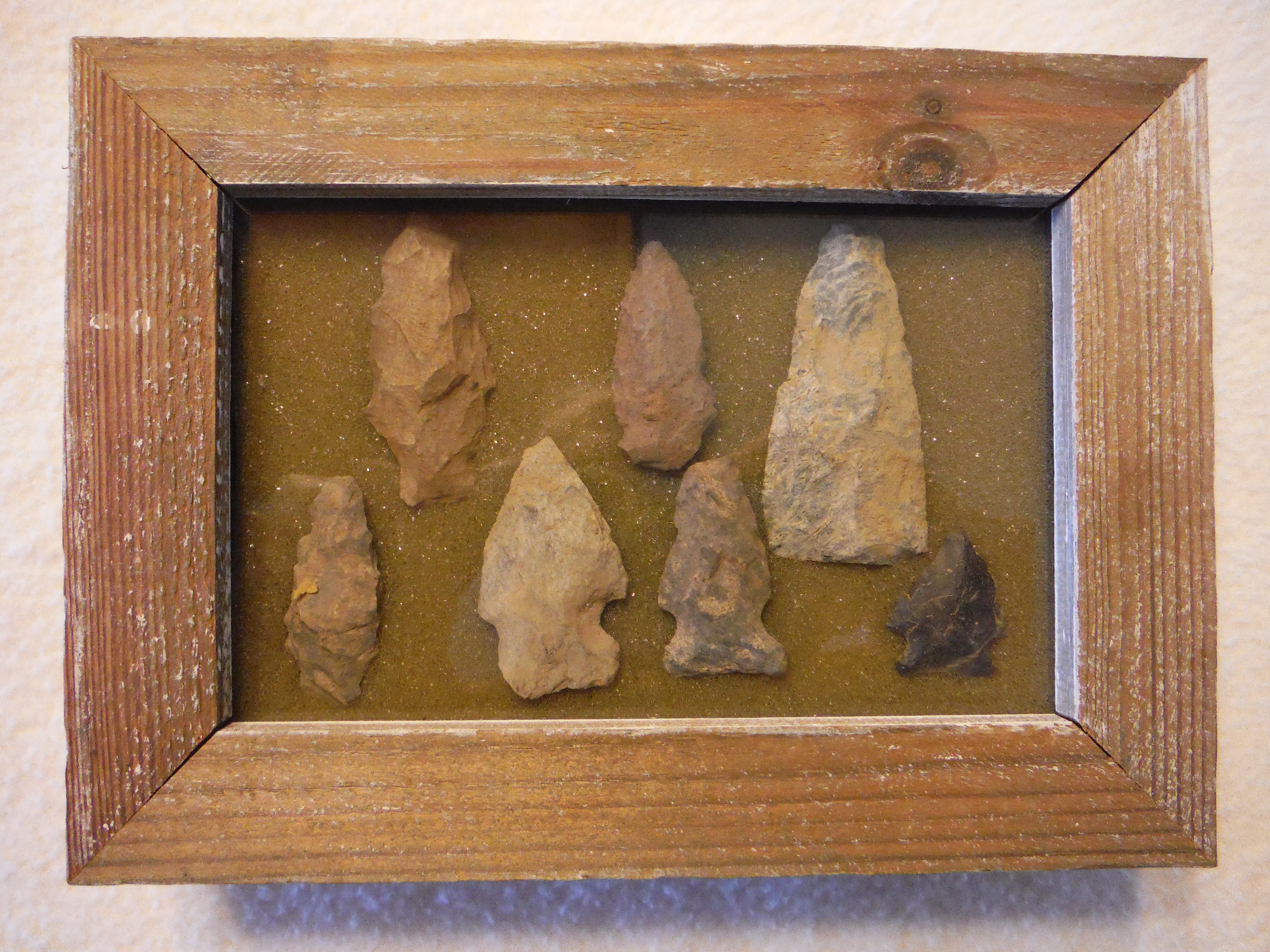 This framed grouping of arrowheads was found by Karl Orndorff and Eric Hemler, around Chicken Run and Pottery Run in and near Bonneauville, 2006 - 2008. Searching permission complements of Richard "Dick" Mills.