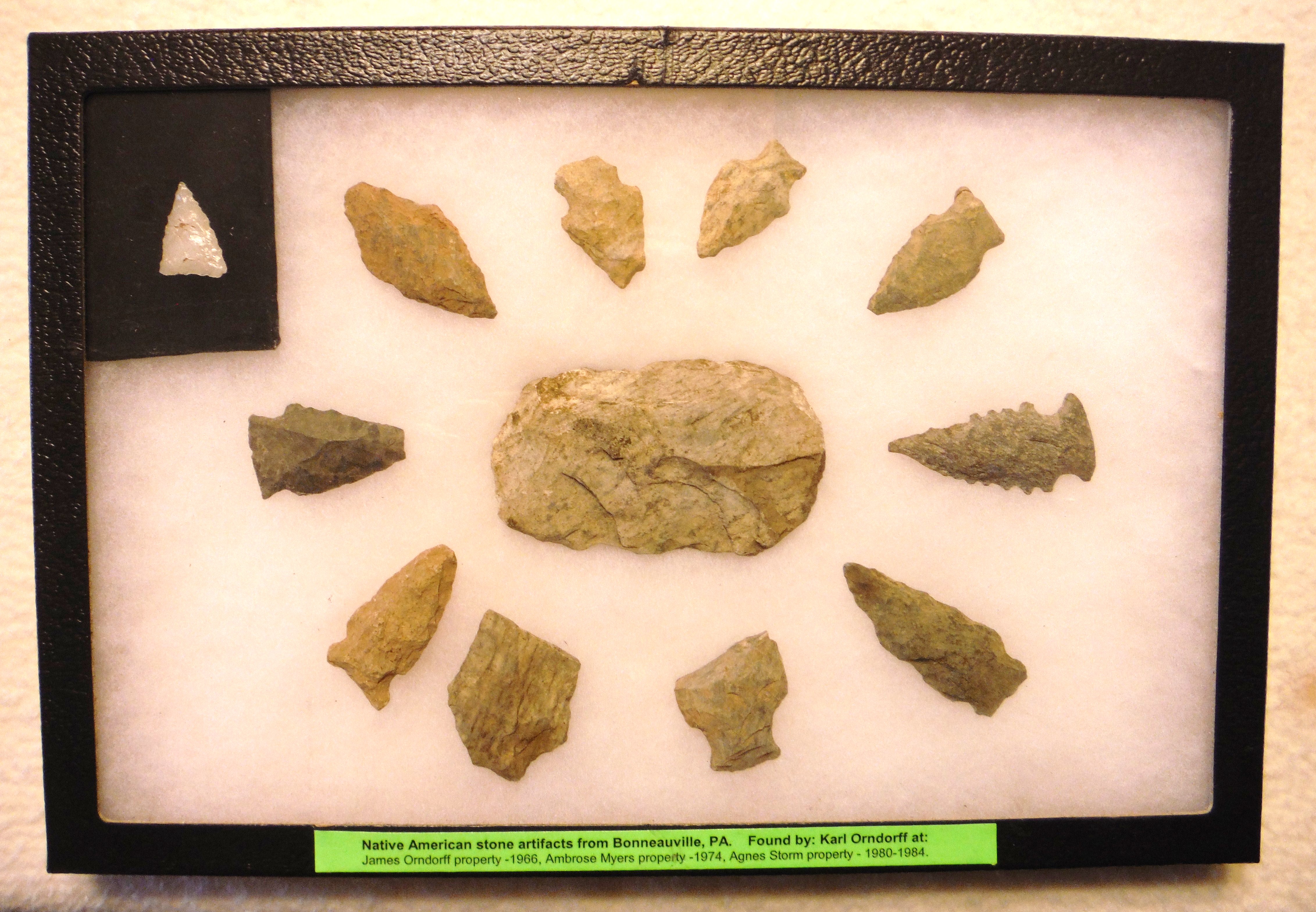 Native American artifacts from Bonneauville, PA. Most were found on the James Orndorff farm at the south-east corner of the town (1966), the Ambrose Myers farm on both sides of Cedar St (1974), and the Agnes Storm farm now the building lots on Jessica Drive in Bonneauville, PA (1980-1984). The delicate white quartz arrowhead at upper left was found on the East Cavalry Battlefield. The center stone is a rhyolite blank found in Bonneauville and once carried from the famous Indian Rhyolite mines located west of Gettysburg (which still exist). The arrowhead at the four o'clock position, with a saw-tooth pattern chipped into it, appears the same as some that date back to about 4,000 BC. The projectile was made of trap rock from a deposit located five miles west of Bonneauville (now Gettysburg Quarry). The point and many others were unearthed in 1966 when Mr. Orndorff excavated for a pond on his property. Many are still there.