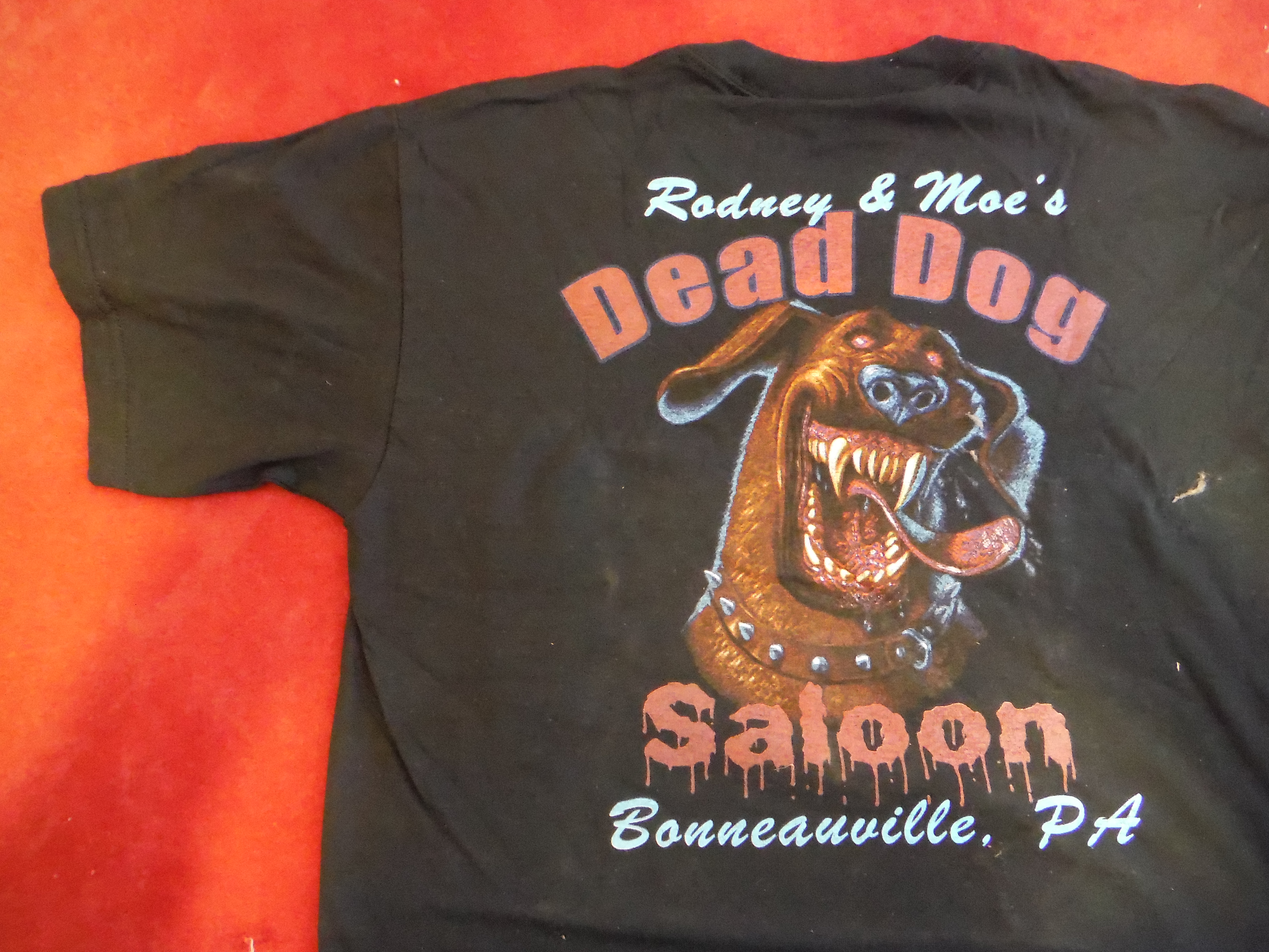 This T-shirt advertises "Rodney and Moe's Dead Dog Saloon" which was located at 55 E. Hanover Street in Bonneauville. The building began its life as the Gray Goose Inn (probably 1930's or 40's). As recalled by the late Frederick Golden, "the Beck's used to collect cigar shipping crates from Golden's Blue Ribbon Cigar Co. They used the wood to build part of their building."