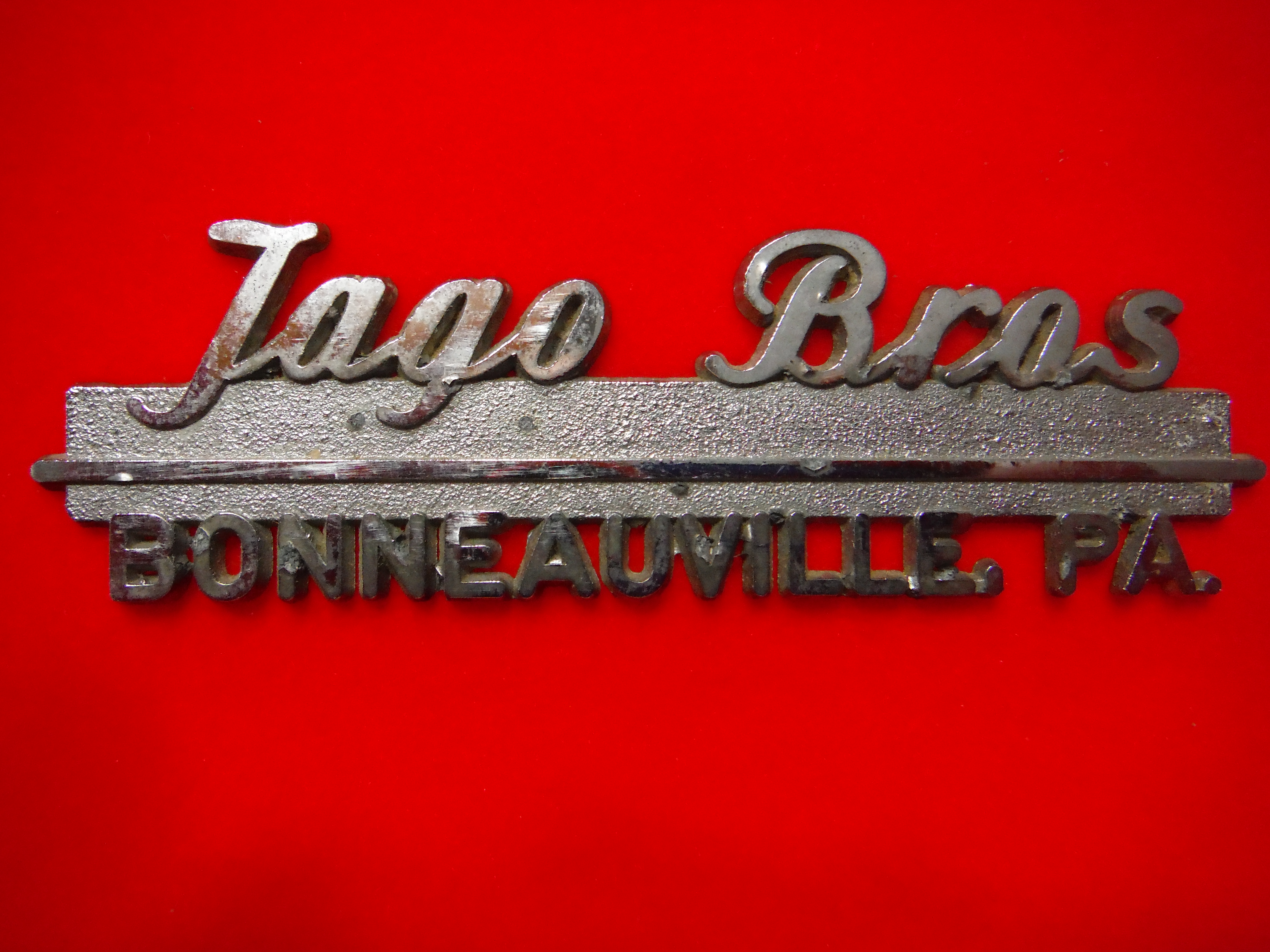 This chrome and black "Jago - Bros. Bonneauville, PA." emblem was one of many placed on the rear of Jago's used cars. Their car lot was located on East Hanover Street in Bonneauville, PA. The Jago's specialized in Cadillac's but also sold other makes of vehicles.
