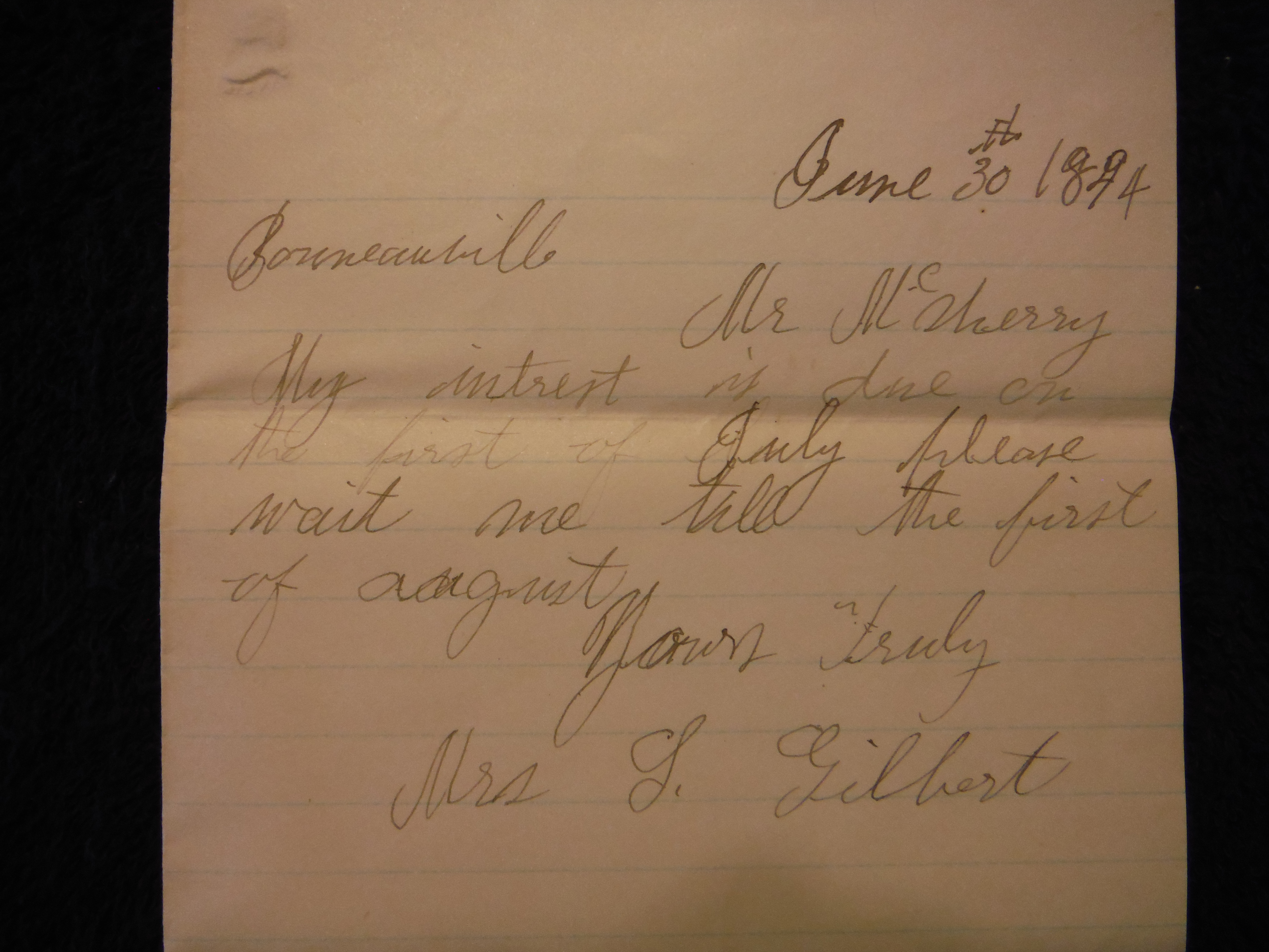 This letter regarding financial matters, was written by Lizzie Gilbert. Mrs. Gilbert resided in a dilapidated two-story house that stood beside the Bonneauville Borough Hall on East Hanover Street until around 1960 when it was razed. She was a Centenarian who remembered the Civil War battles in Gettysburg and near Bonneauville. Troops by the thousands wearily marched by her house on the way to a battle which had already begun. Regarding the conflict she once noted; "We all thought we were going to die." The statement likely reflected the fear that most of Bonneauville's citizenry felt at the time.