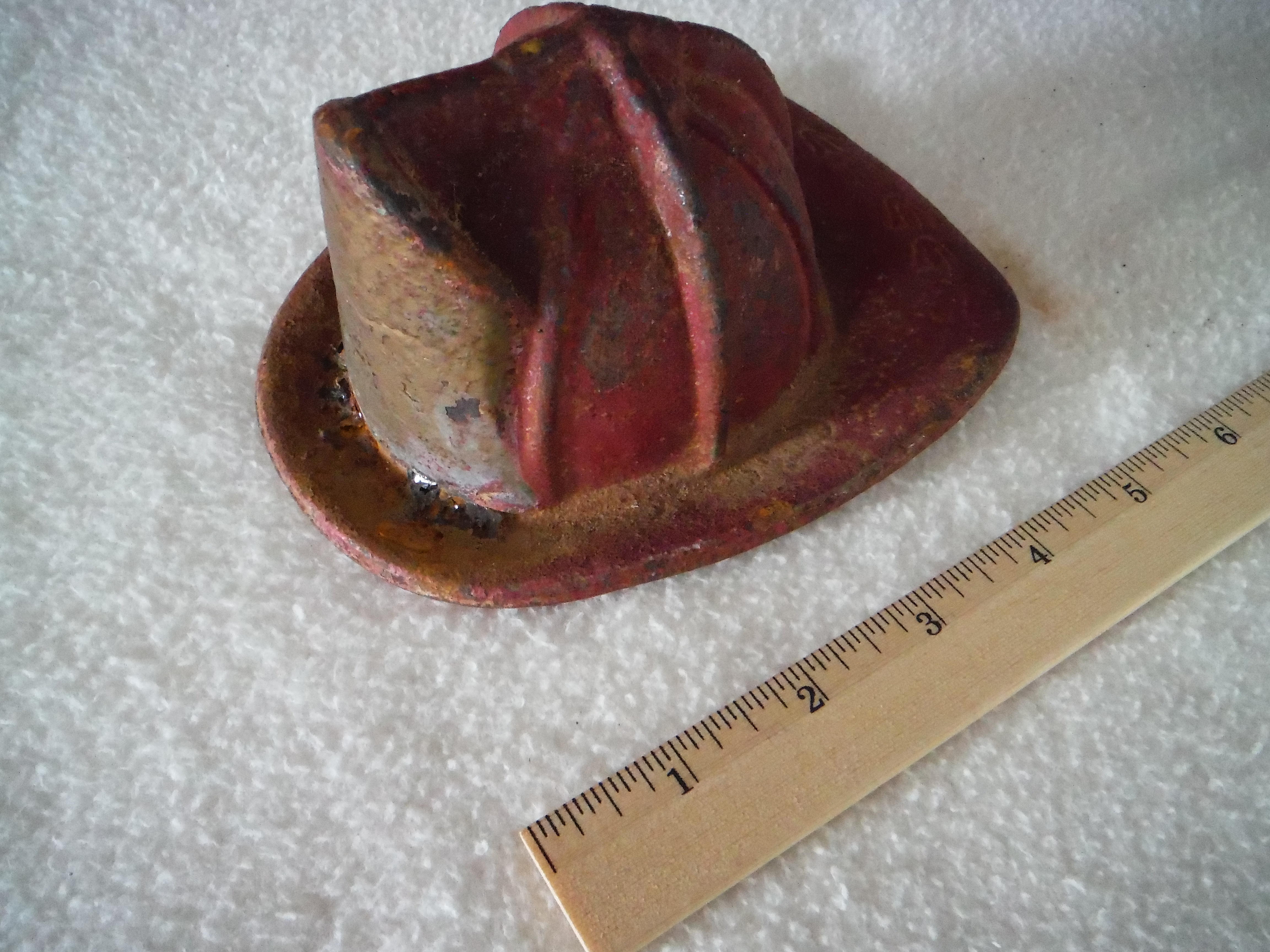 Similar cast-iron helmets can be found on Ebay with an adhesive-backed "Fireman's Fund" label attached to the front shield. This piece may have been a homeowners insurance perk.