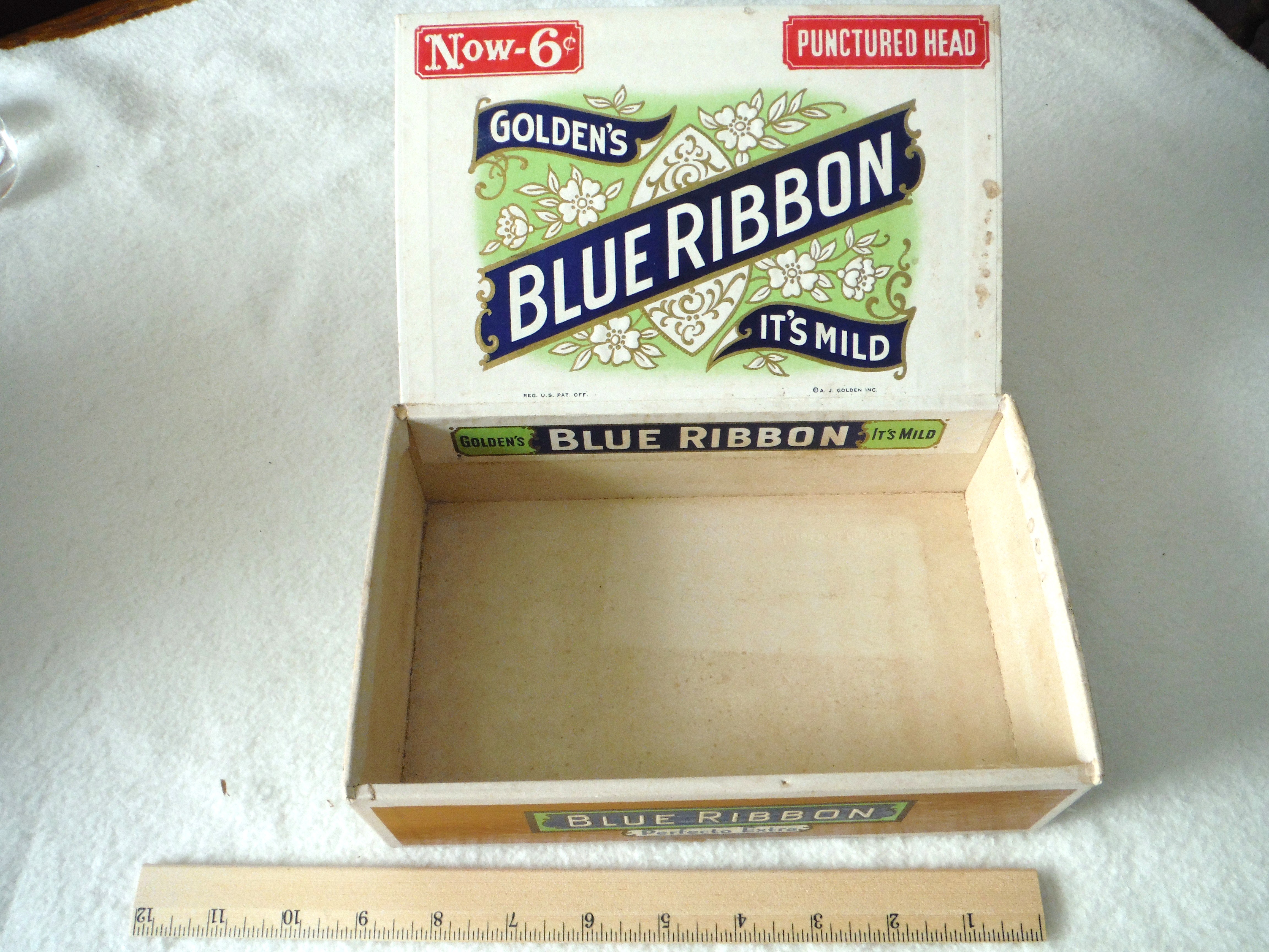 "Golden's Blue Ribbon." Cardboard cigar box. "It's mild, Punctured head, Now 6 cents." Class C, Permit No. 777, PA, 50 cigars.