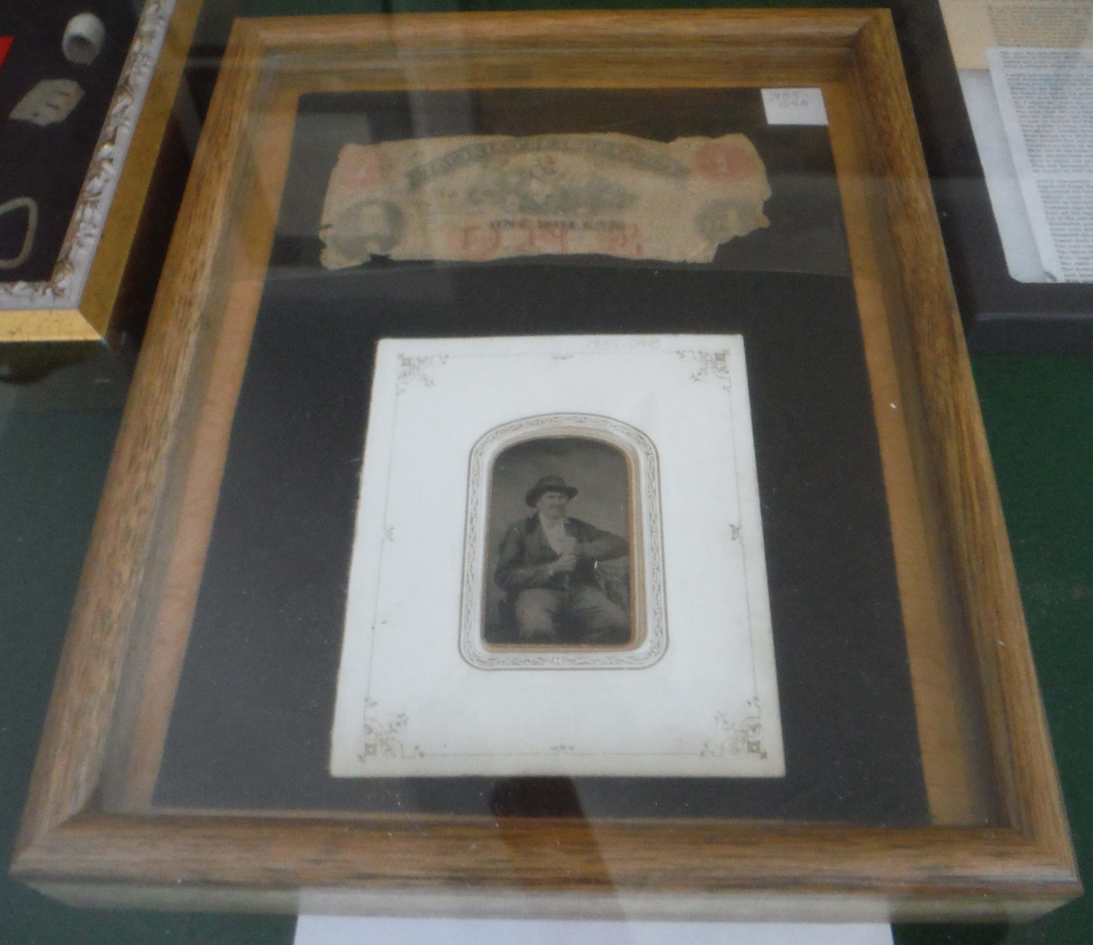 Overview; Framed Display Box; John Burns and a Confederate $1.00 Bill.