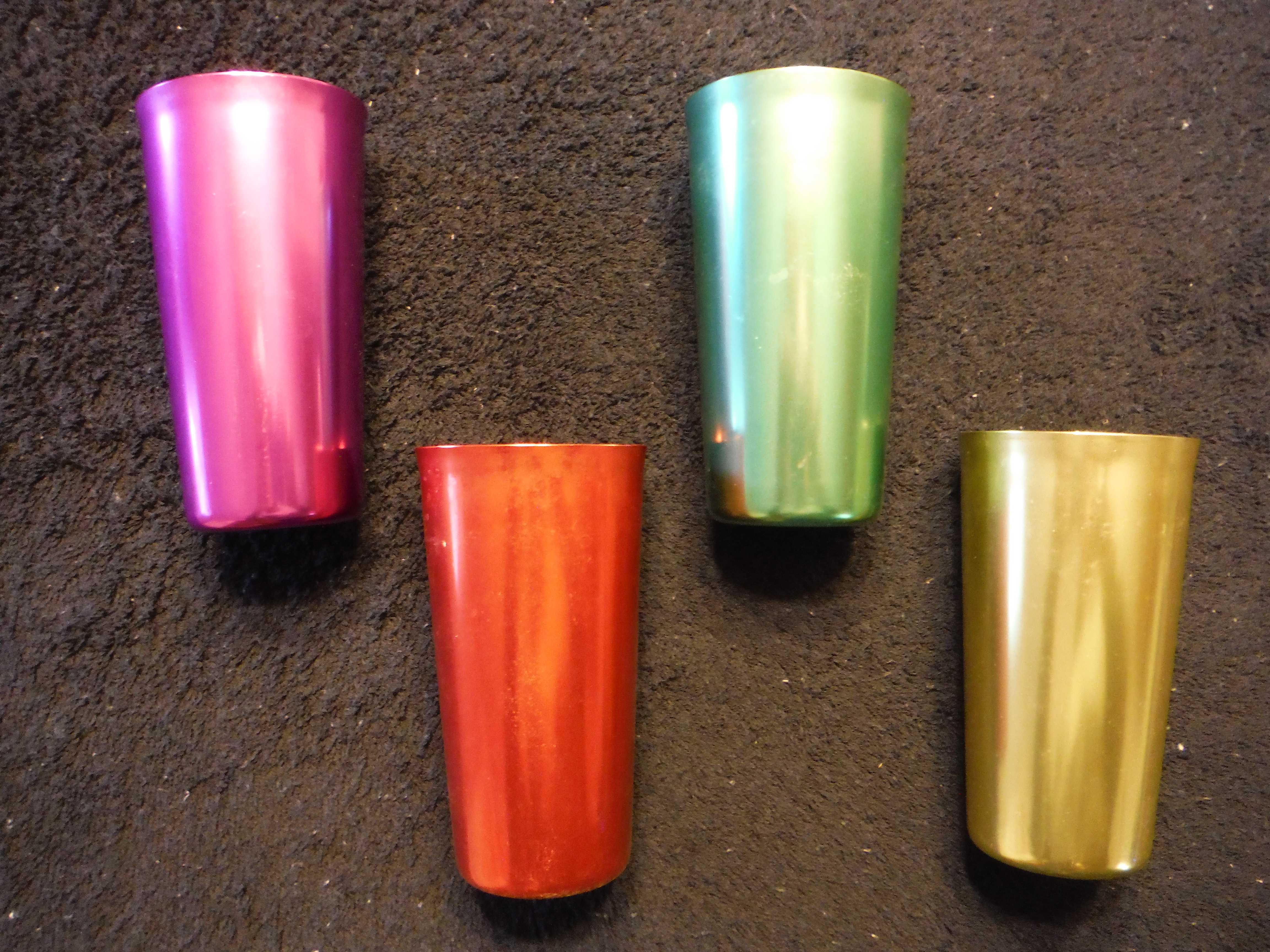 Color Craft aluminum tumblers were produced in the early 1960's. At that time, the draw-formed shape of the aluminum glass coupled with the rich chromatic anodized colors and light weight was unique. Technology had progressed to a point where such attractive pieces were economical to produce. Their popularity soared for years. Stores and gas stations used them as premiums. At Eugene Craig's Cities Service gas station in Bonneauville, one glass could be had for each fill-up of the gas tank. Choose your favorite color. In addition to these four colors, red, green, purple and gold, blue, silver and perhaps others were available.