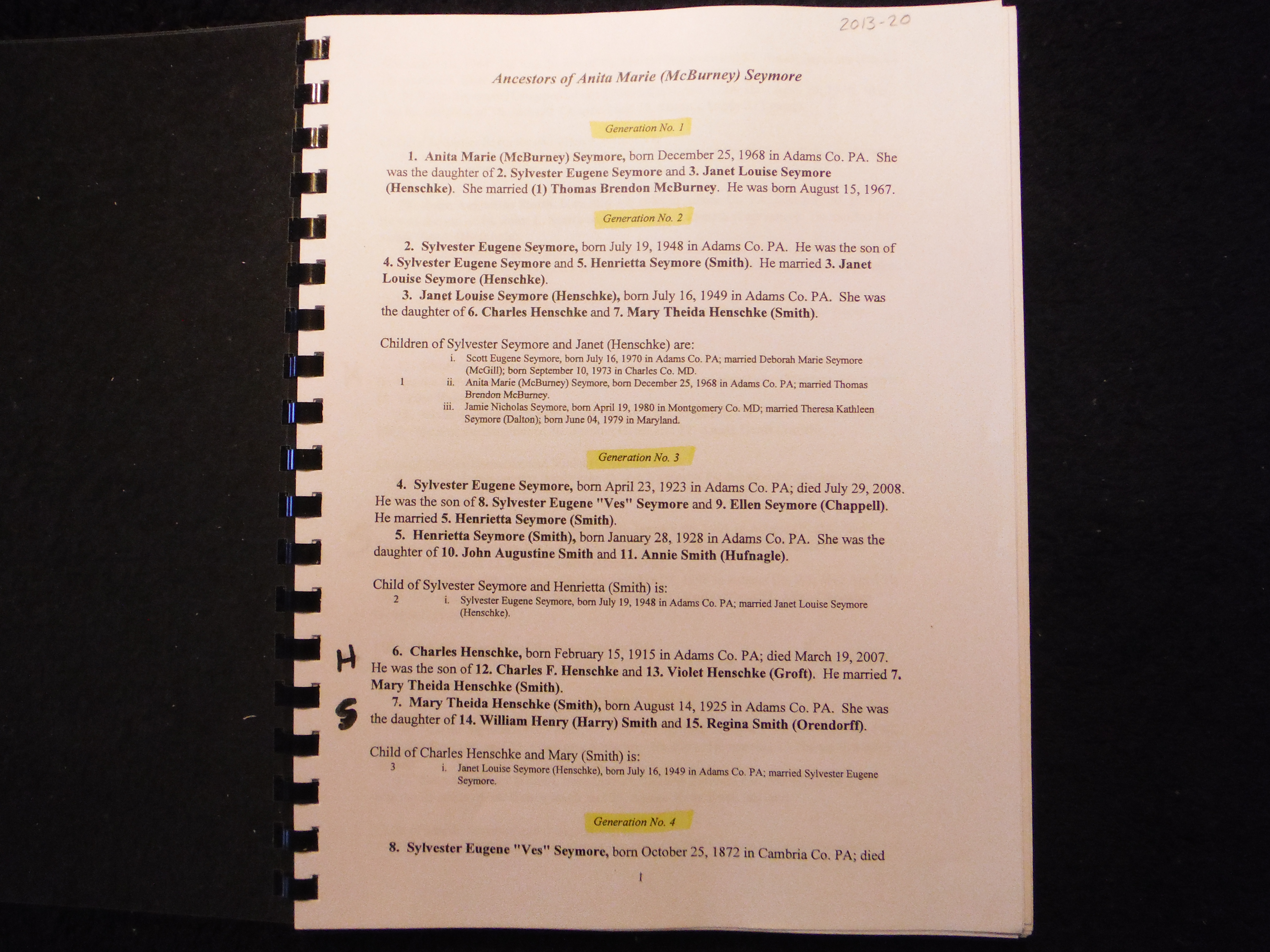 This booklet references the family of Sylvester and Henrietta Seymore, 15 Maple Street, Bonneauville, PA. The Seymore home was once the funeral parlor of Civil War Captain Jacob Miller. John Burns, "The Hero of Gettysburg" was prepared for burial there.