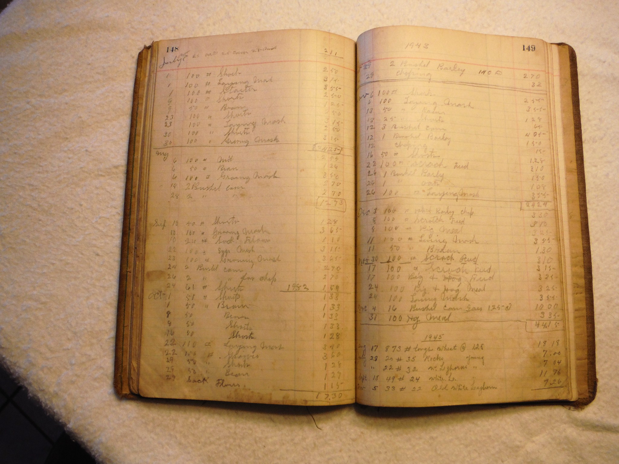 I. V. Noel 1936-1946 ledger documenting farm produce, hens, chickens, hogs, expenses, groceries, loaves of bread and feed.