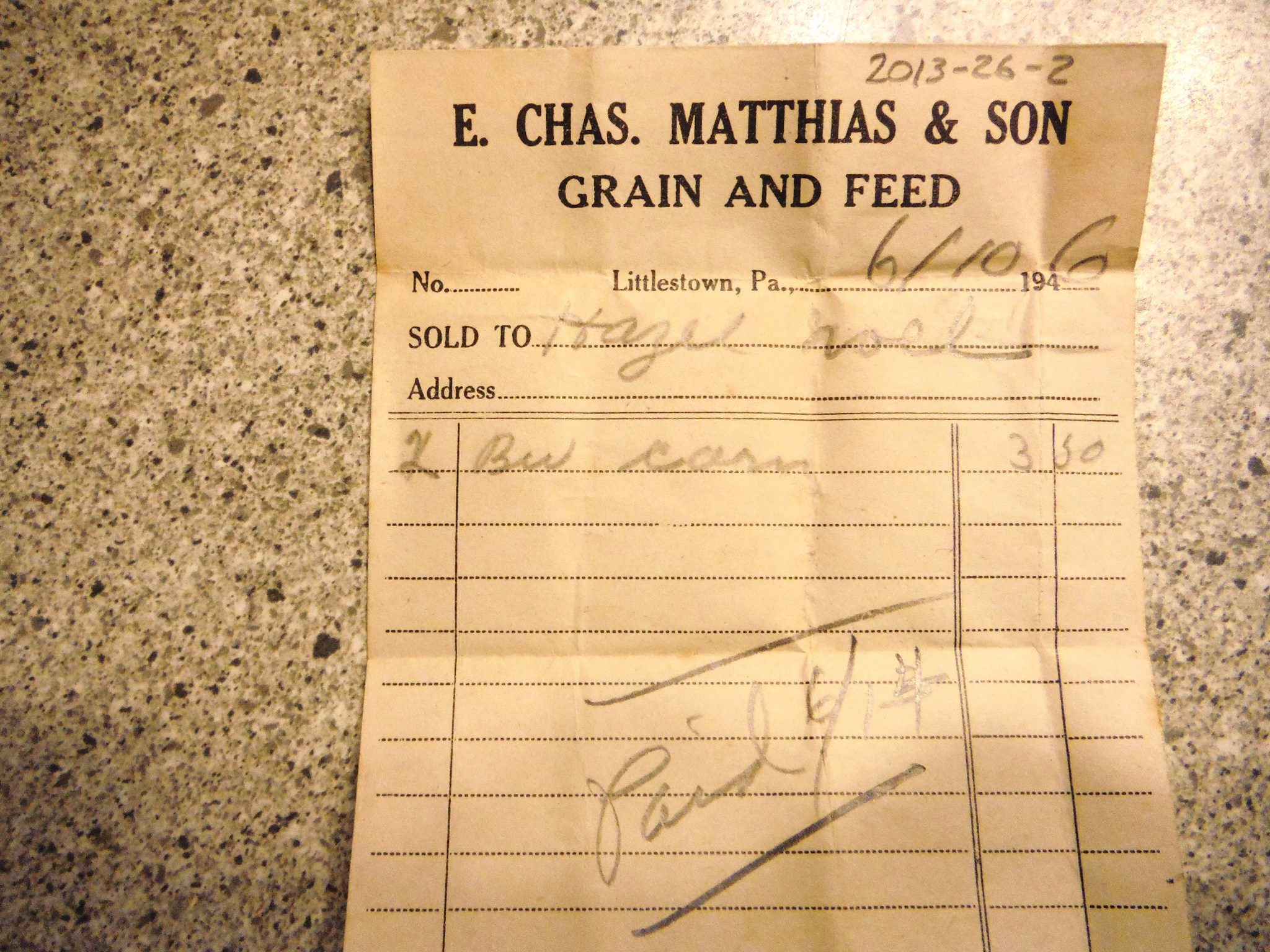 Receipt; E. Chas. Matthias & Son, Grain and Feed, Littlestown, PA.