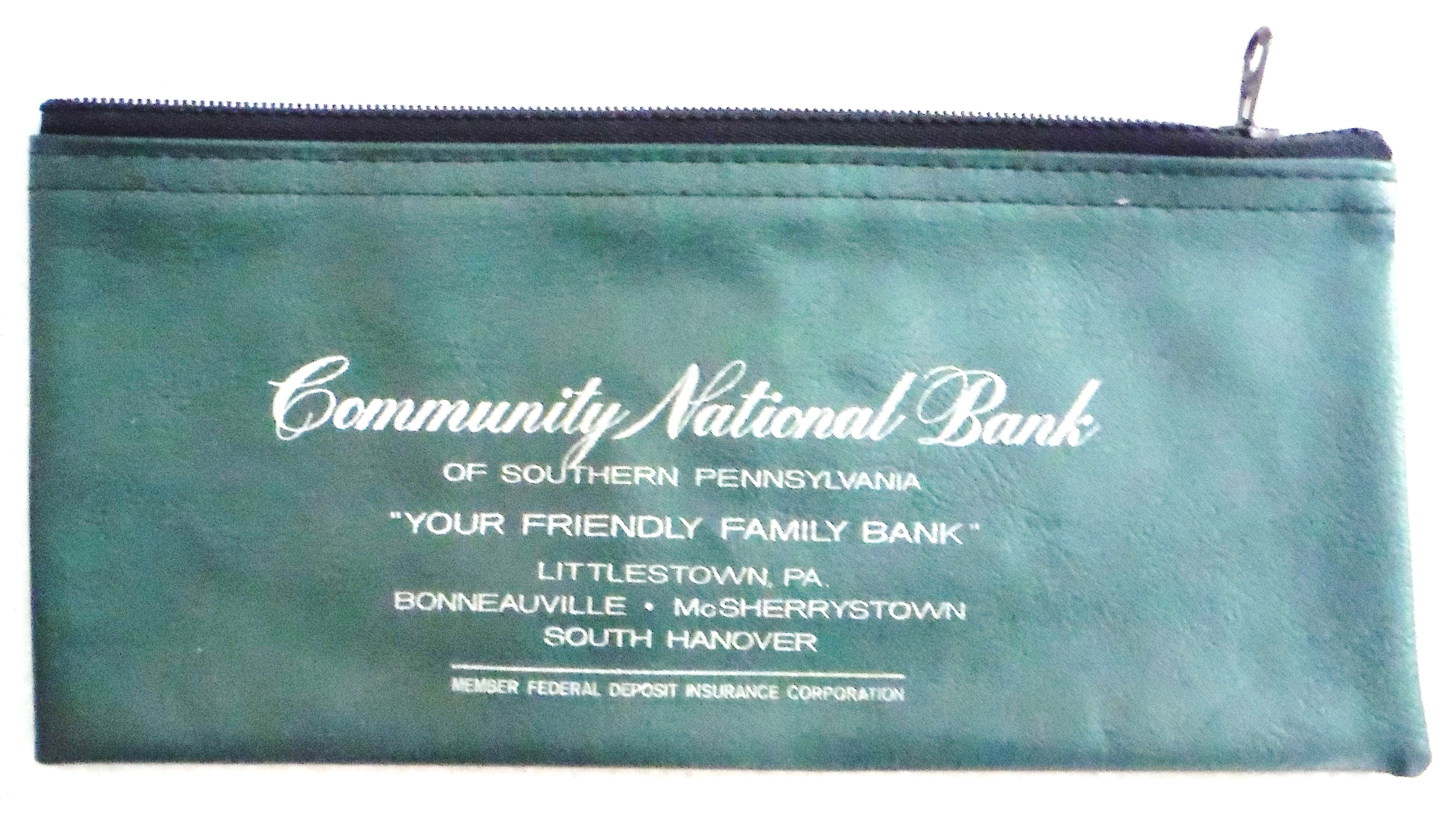Bank deposit money bag from Community National Bank, Bonneauville branch office.