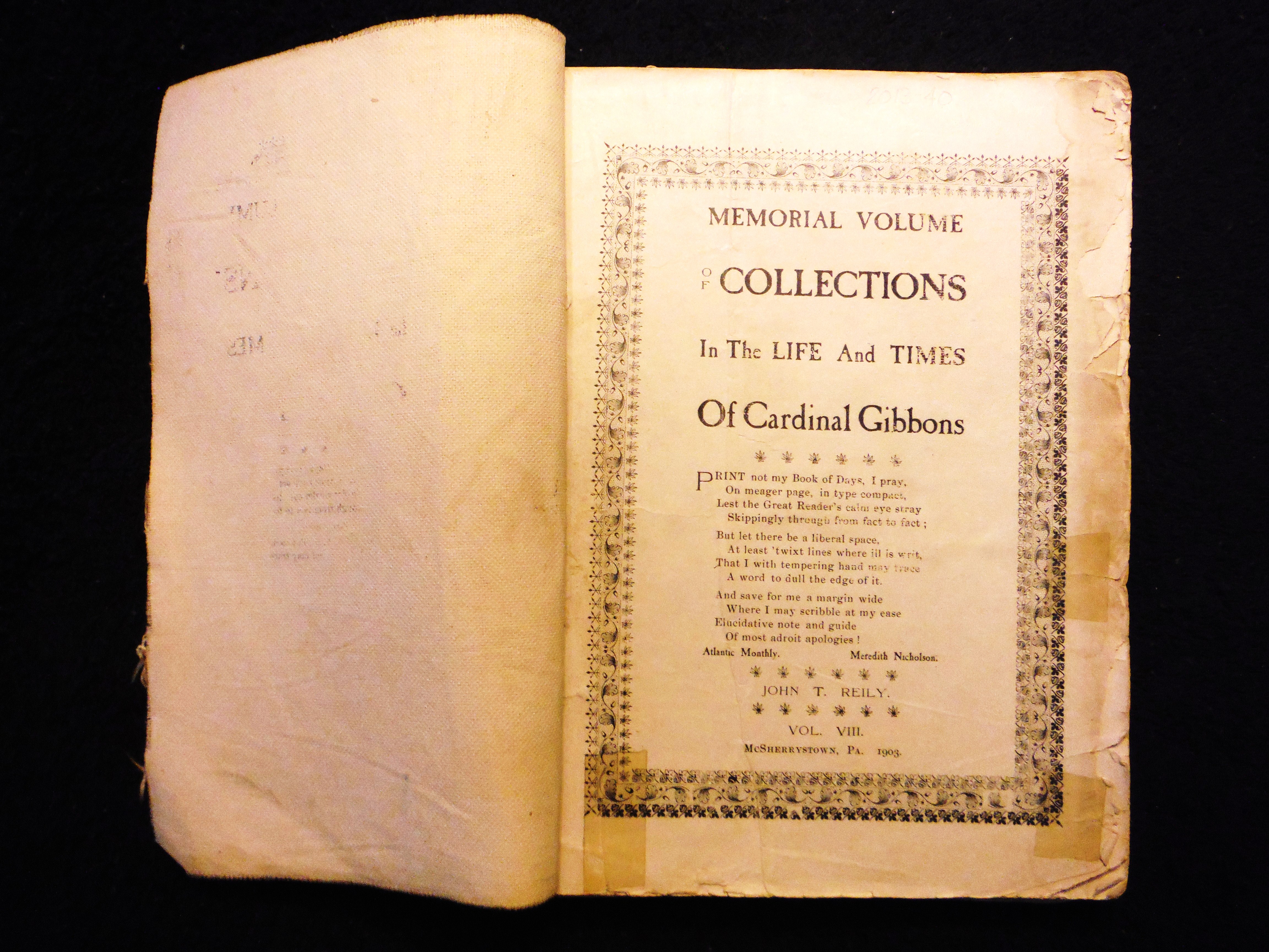 John T. Reily, for whom the John T. Reily Historic Society of McSherrystown, PA was named, is known as "The most quoted Catholic author in the United States." His many volumes were written in the late 19th and early 20th Centuries. Reily ran his own press and custom made books for individuals who came into his store/press room. Interestingly not all of Reily's volumes are the same (i.e. not all Vol. VII's are the same.) If a customer requested pages one to one-hundred from Vol. I, page 299 to 420 from Vol. IV etc., he would print the custom book under the most current Volume No.