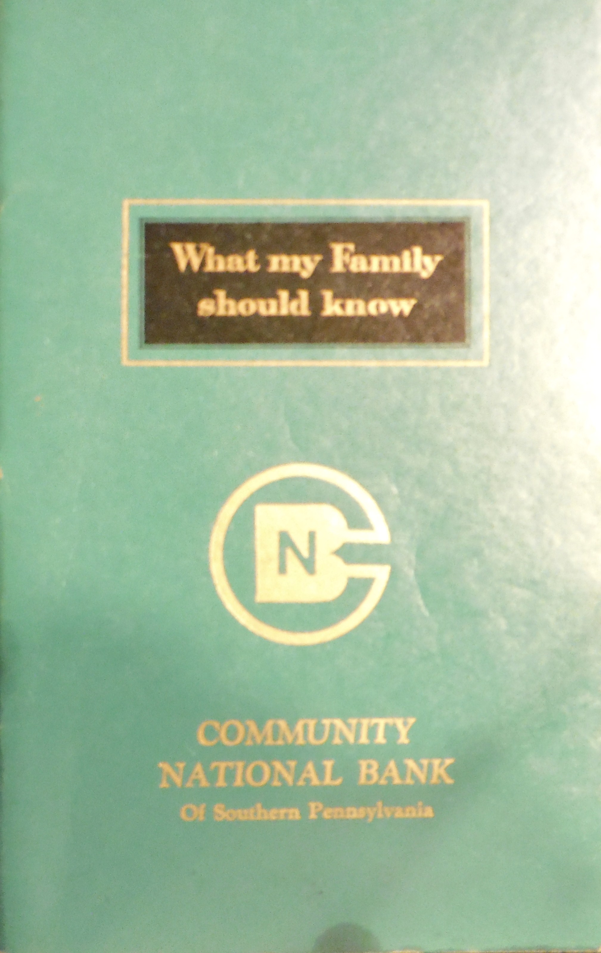 Booklet; "What My Family Should Know" Community National Bank of Southern Pennsylvania. See Cat. No. 1971-03, 1973-01 and 1985-01 for 1971, 1973 and 1985 Community Natl. Bank, Bonneauville Calendars.