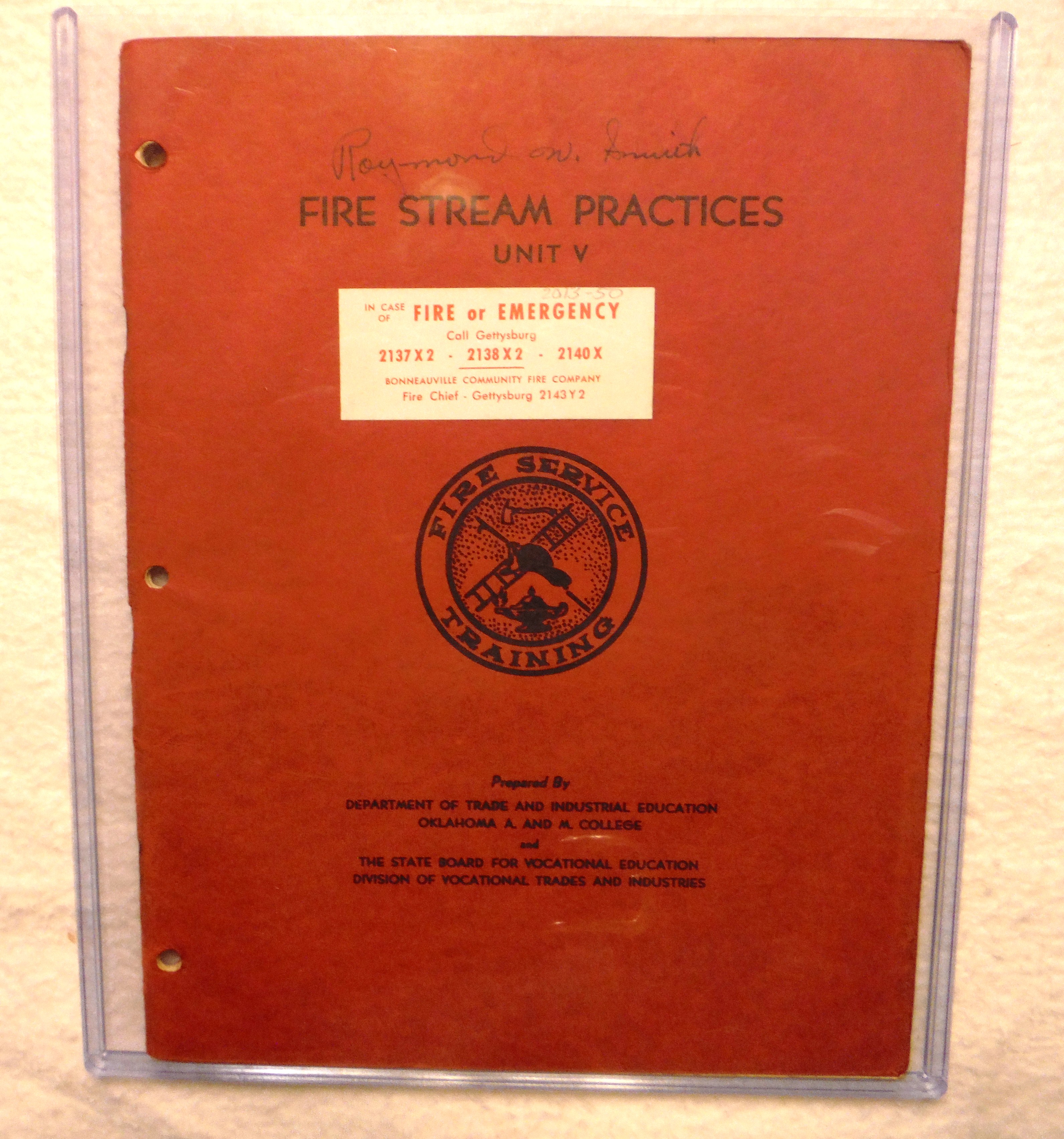 Booklet; "Fire Stream Practices," Unit V, Signed in Ink; "Raymond W. Smith."