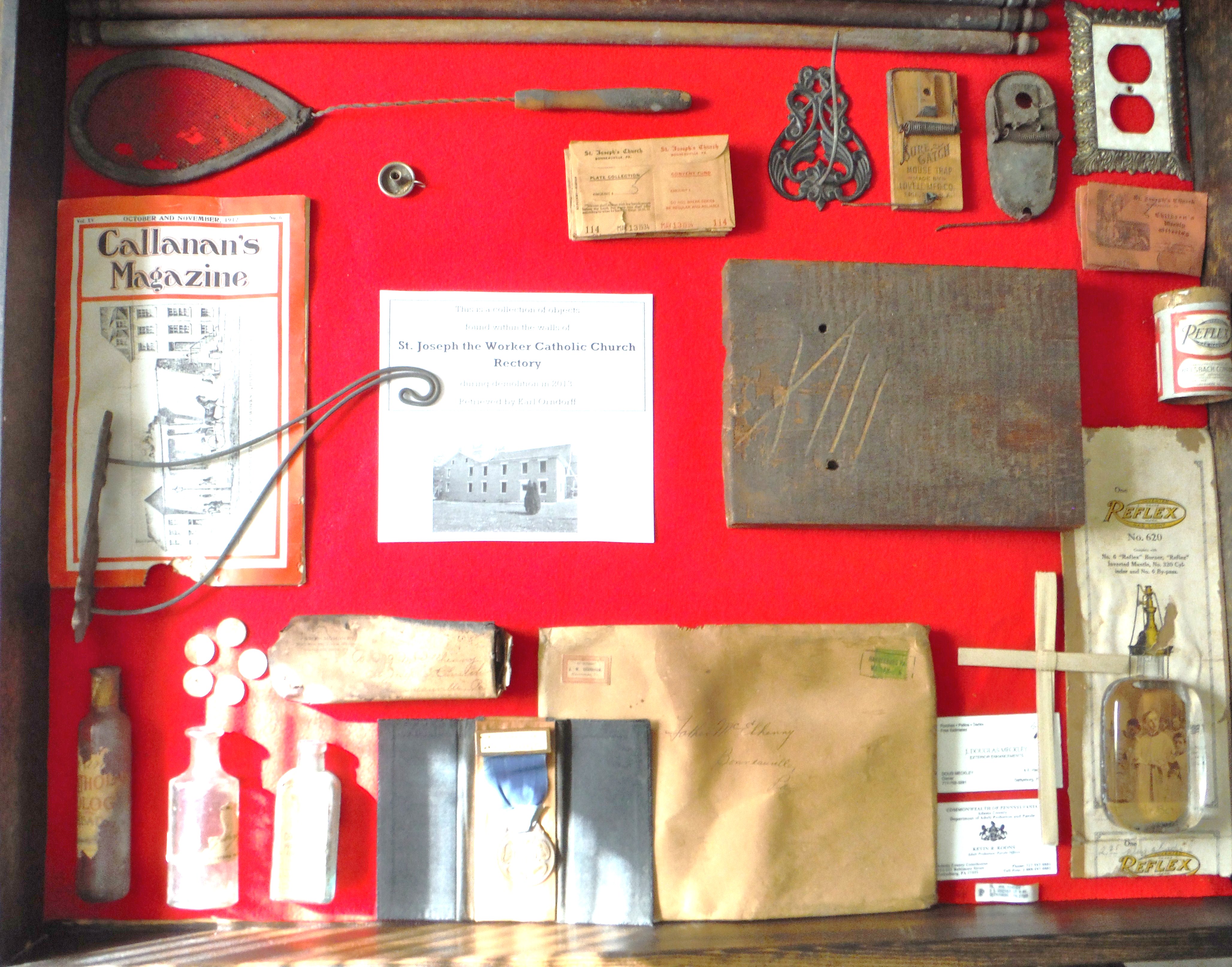 The following items were collected from St. Joseph's Rectory in Bonneauville in the Fall of 2013. It was then that the building was being prepared for dismantling. The old brick structure was constructed in the last half of the 19th Century and had suffered many decades of neglect. The building was partially dismantled for recycling and environmental reasons. In the process, the walls and hollow spaces were carefully scrutinized. Behind stairwells, old chestnut trim, paneling and wainscoting lie bits of history that are here displayed.