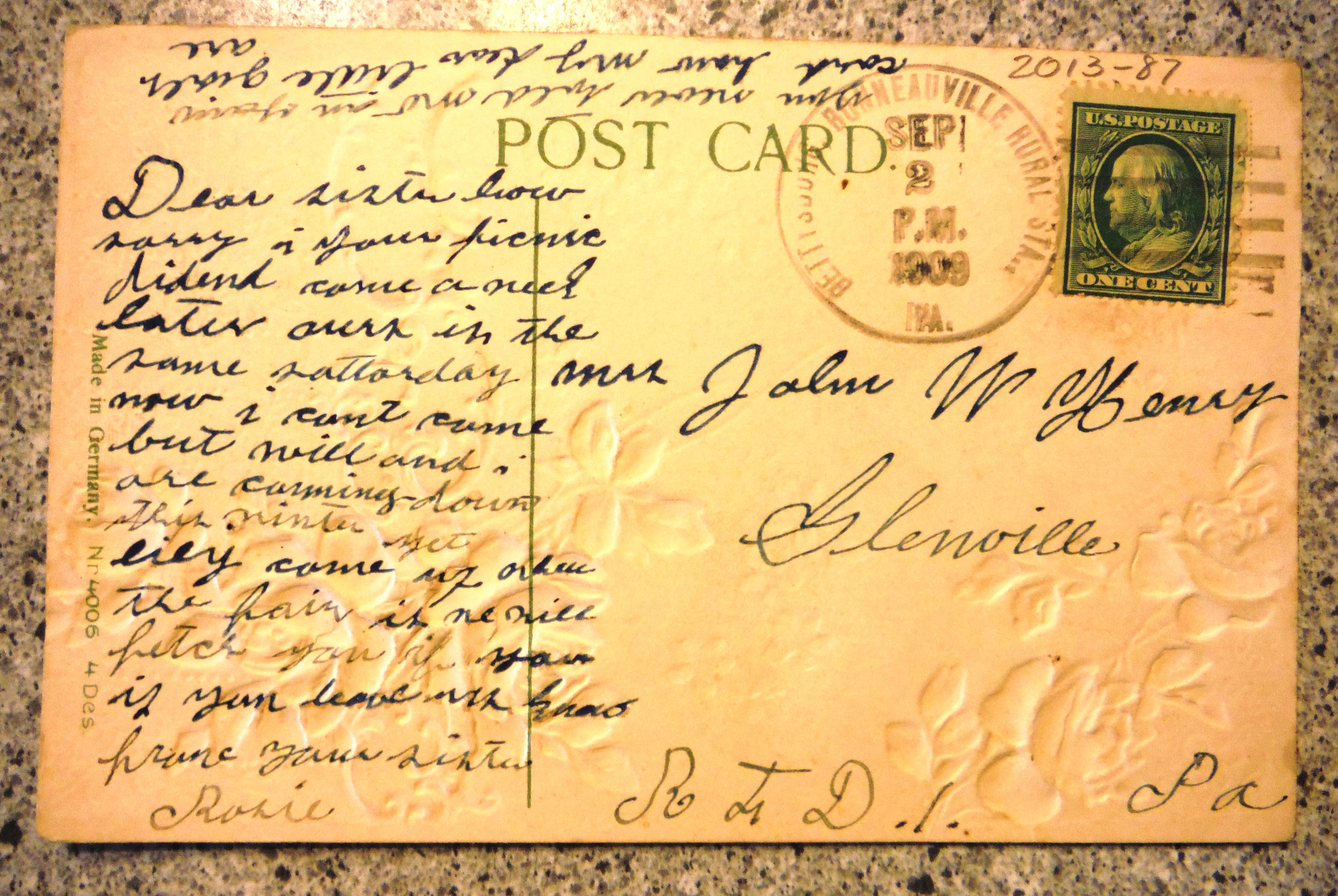 Reverse: Addressed to; Mrs. J. W. Henry, Glenville RD# 1, PA Bonneauville Rural Station, 1909;