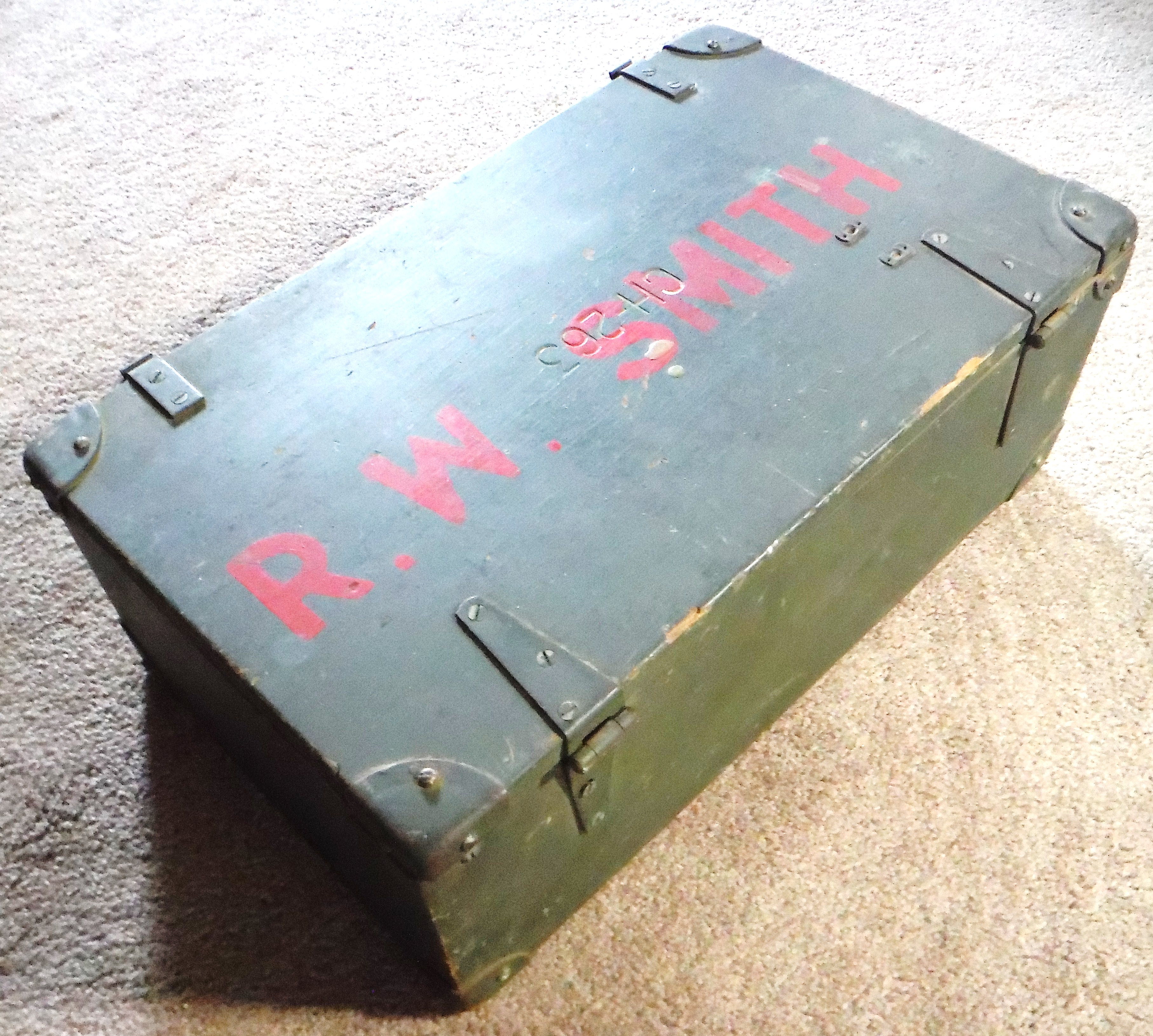 17" x 10" x 7". Stenciled "R. W. Smith" on top, in red. Engraved; "CH-263" on lid. Compartmentalized.