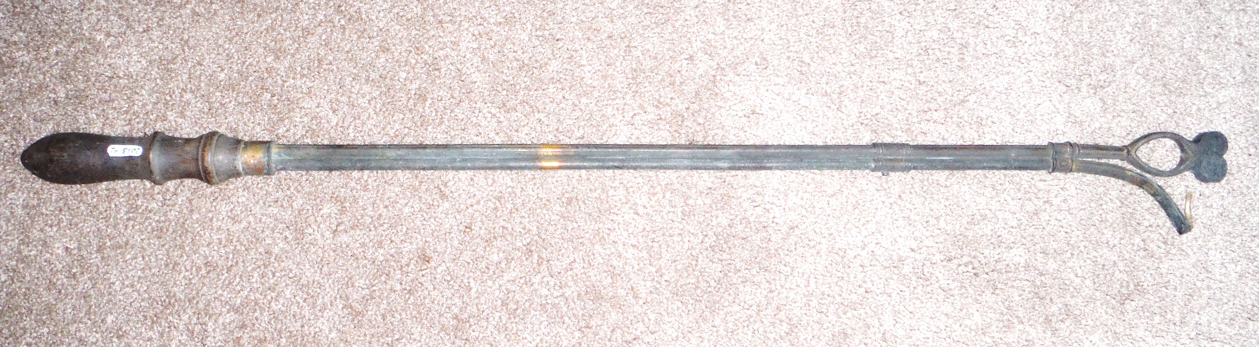 Early candle lighting device. Brass with wood handle. Manufacturer marked "Houchin No. 620, New York." 30" length. Recovered from behind the stairwell of the attic steps upon demolition of St. Joseph's Rectory in 2013. Note the absence of a conical snuffer which was incorporated on later models.