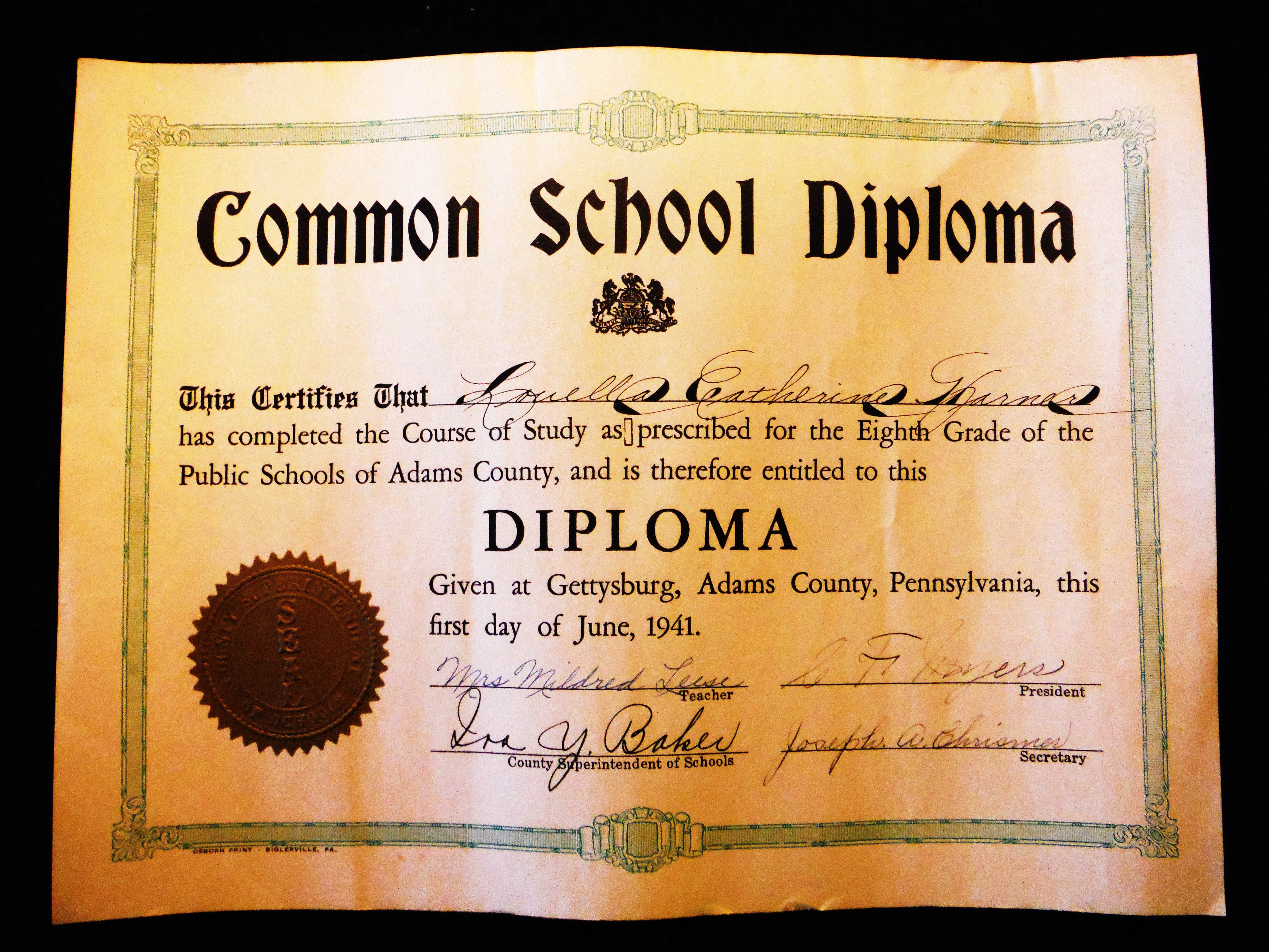 Certificate; 1941, WWII Era Common School Diploma; Louella Catherine Harner.