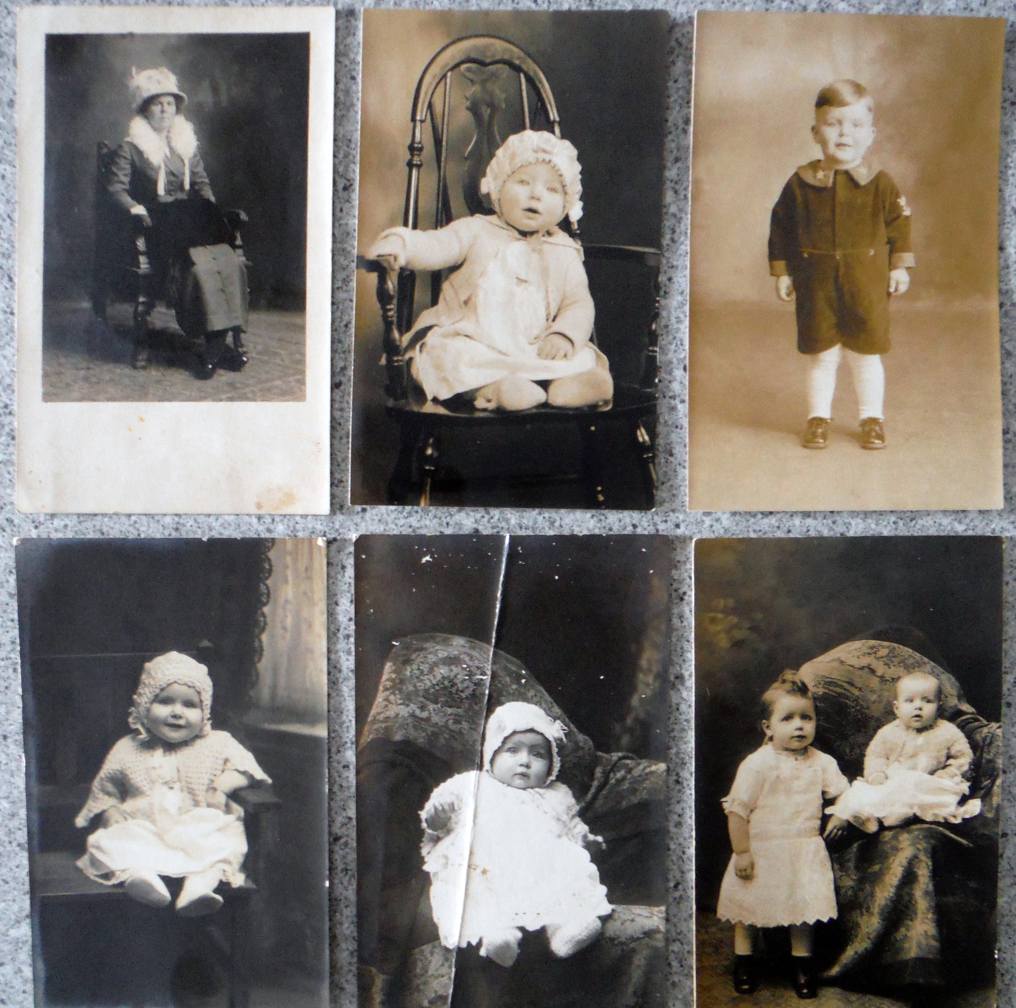 This collection of twelve portrait real photo postcards were grouped with Kuhn and Eck family photo albums when found. (Ref Cat. No's: 2014-08AA and 2014-08AB.) All hand-written markings on backs of photos (which are minimal,) are in quotes and italicized below.