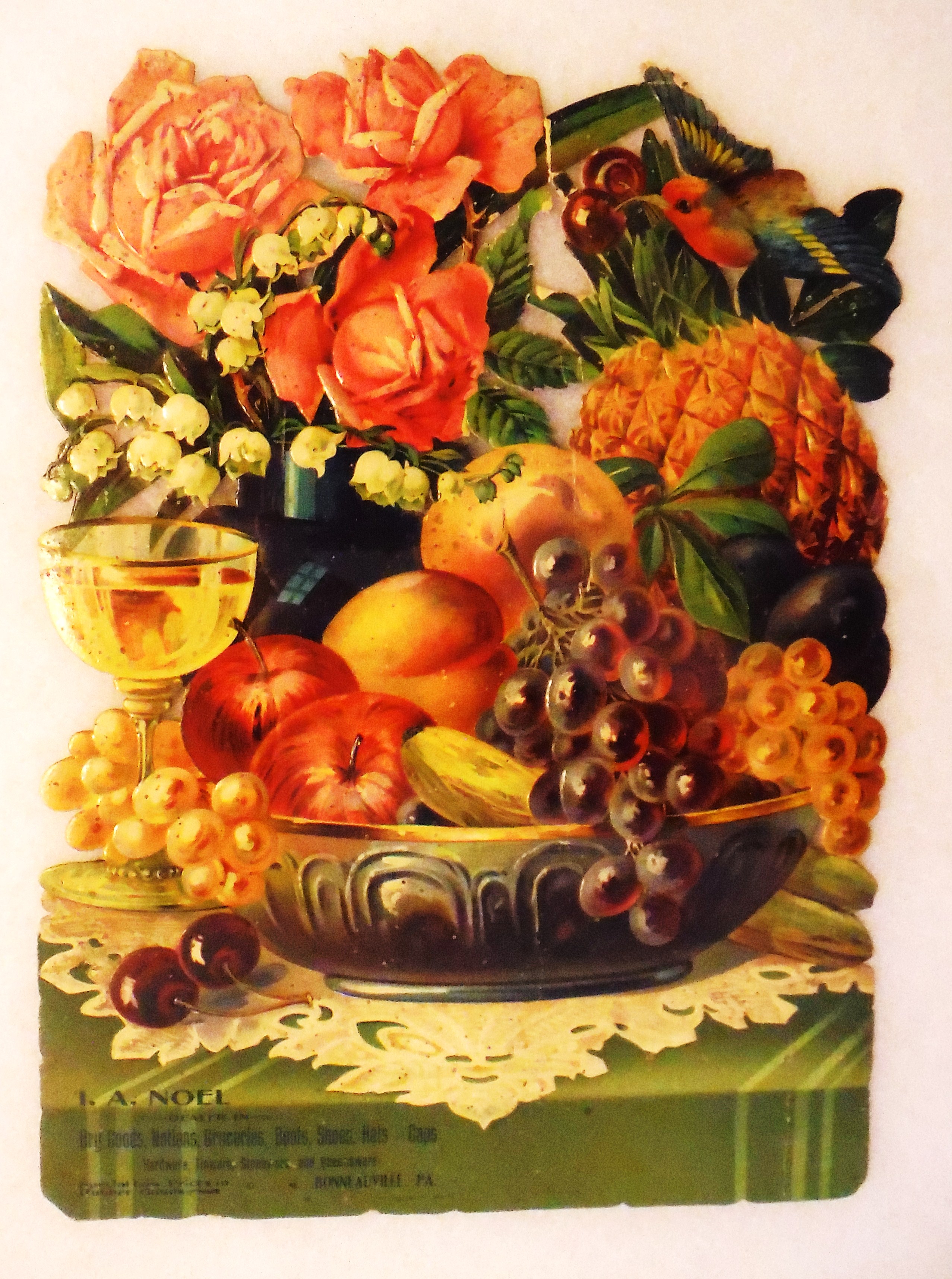 This is a first decade of the 19th Century, I. A. Noel calendar from Bonneauville, PA. The condition is very good. Backer only, no date pages remain. Embossed Fruit and flowers are the still-life motif. The chromolithographic art printing colors are vivid.
