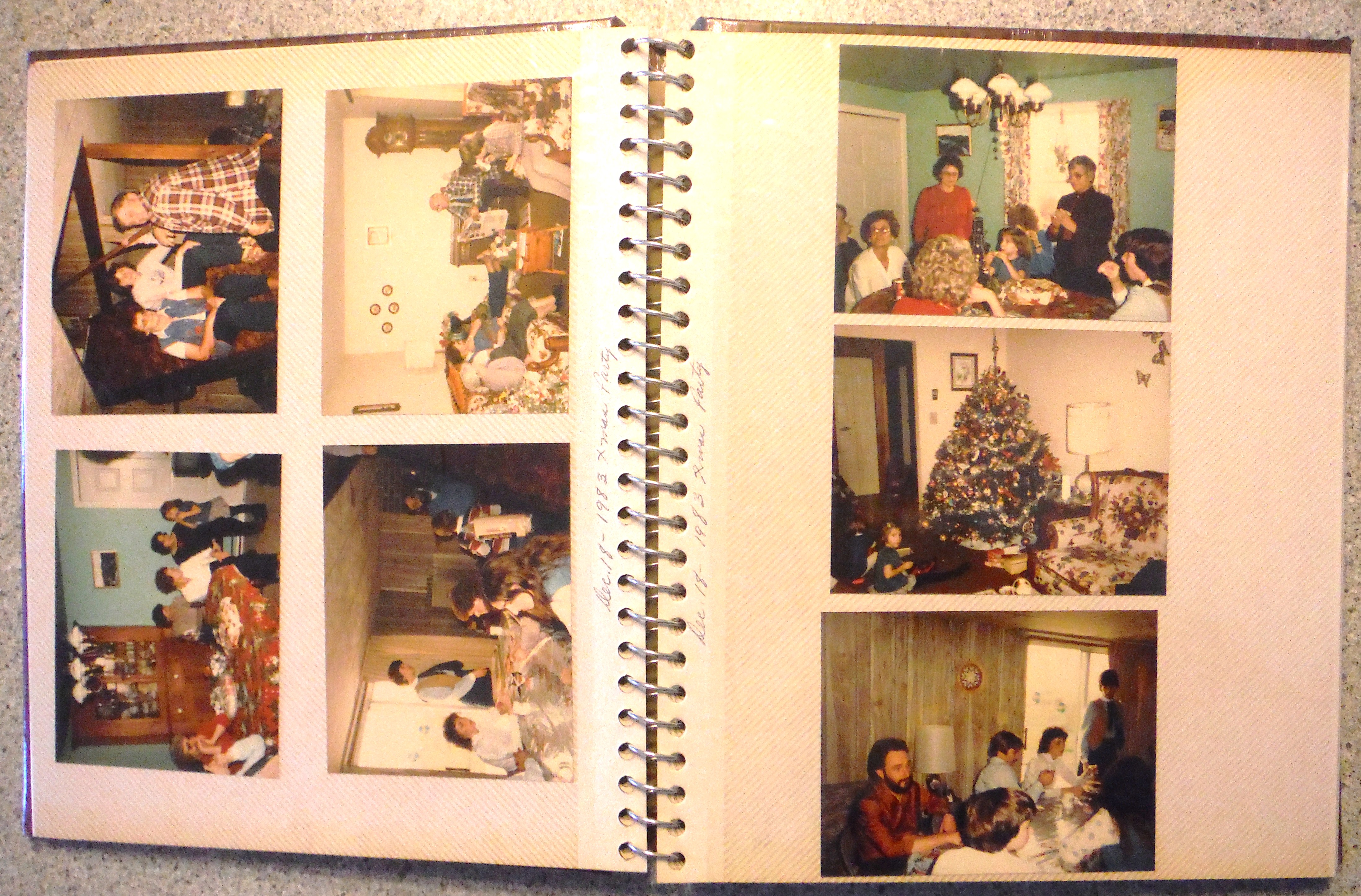 Contemporary photo album. Pages dated 1982 - 1984. Handwritten page titles; "Dec. 19, Baker Party, 1982...," "Dec 1983 Xmas Party," and "Baker's Family Xmas Dinner, 1984," etc.