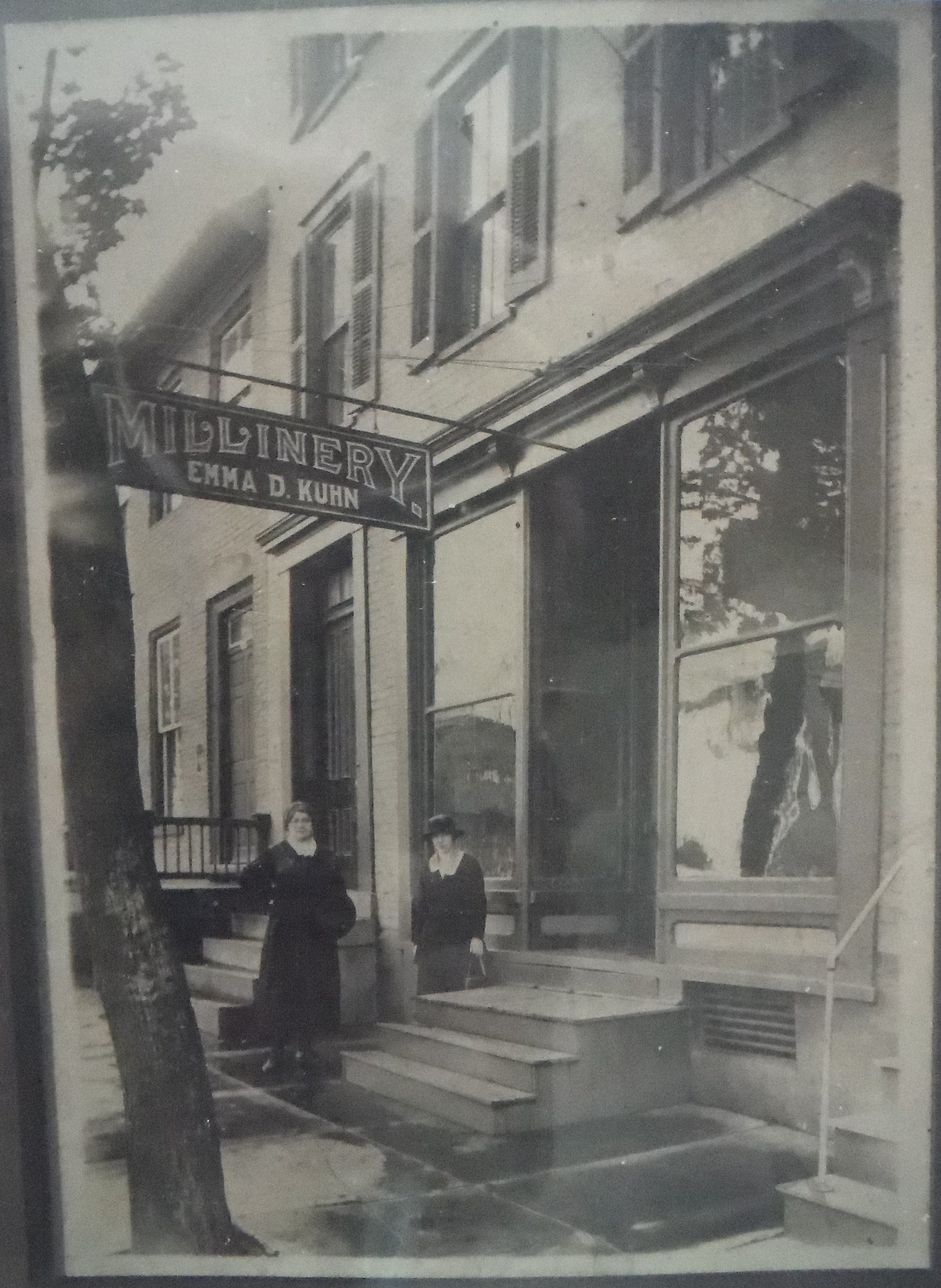Note: The in-town-store (not Bonneauville) with the sign "Millinery, Emma D. Kuhn." Note that the wooden sign Cat. No. 2014-08C which was found in the Kuhn's attic may have come from this location.