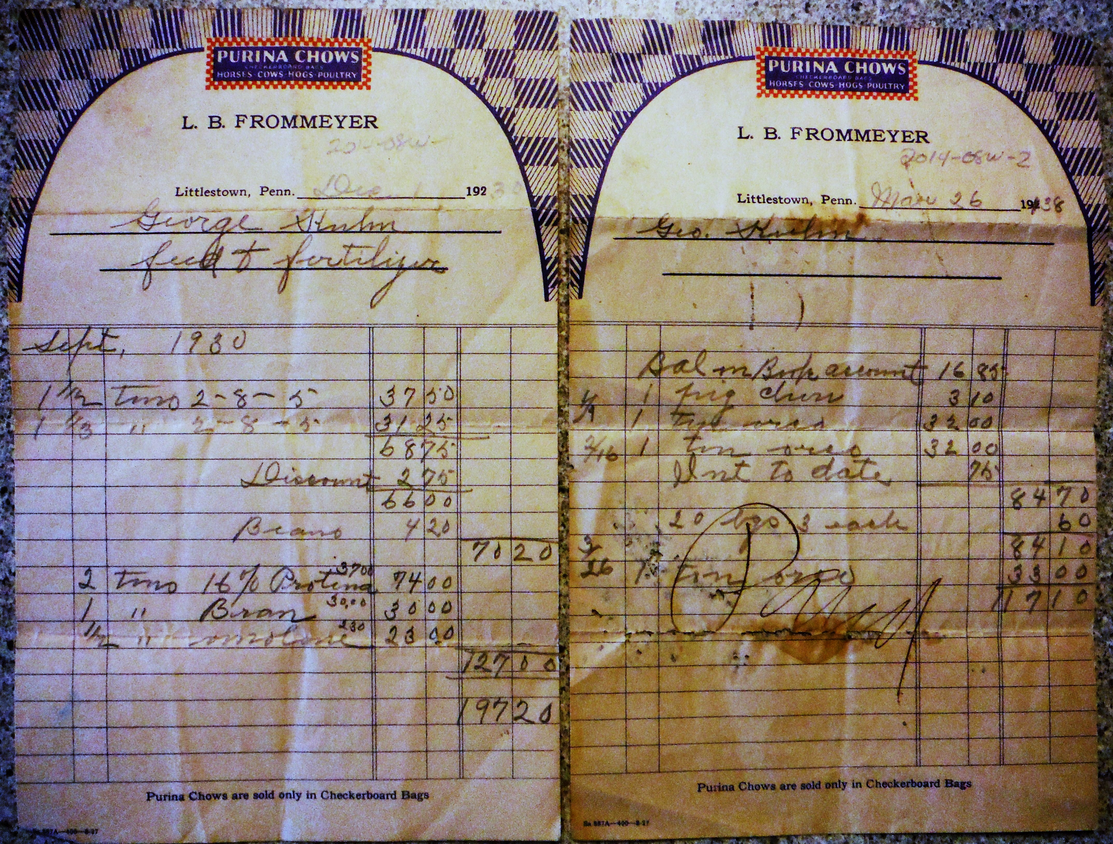 2014-08W-1 & 2, Receipts; L. B. Frommeyer operated an animal feed supply house in Littlestown, PA, that specialized in Purina Products. Mr. Frommeyer lived in Bonneauville, PA and operated a second feed mill from that location. The mill and home are located at what today are 52, 54 and 56 East Hanover Street apartments. These receipts represents George Kuhn's Dec. 1, 1930 and Mar. 26, 1938 purchases of feed, fertilizer, etc.