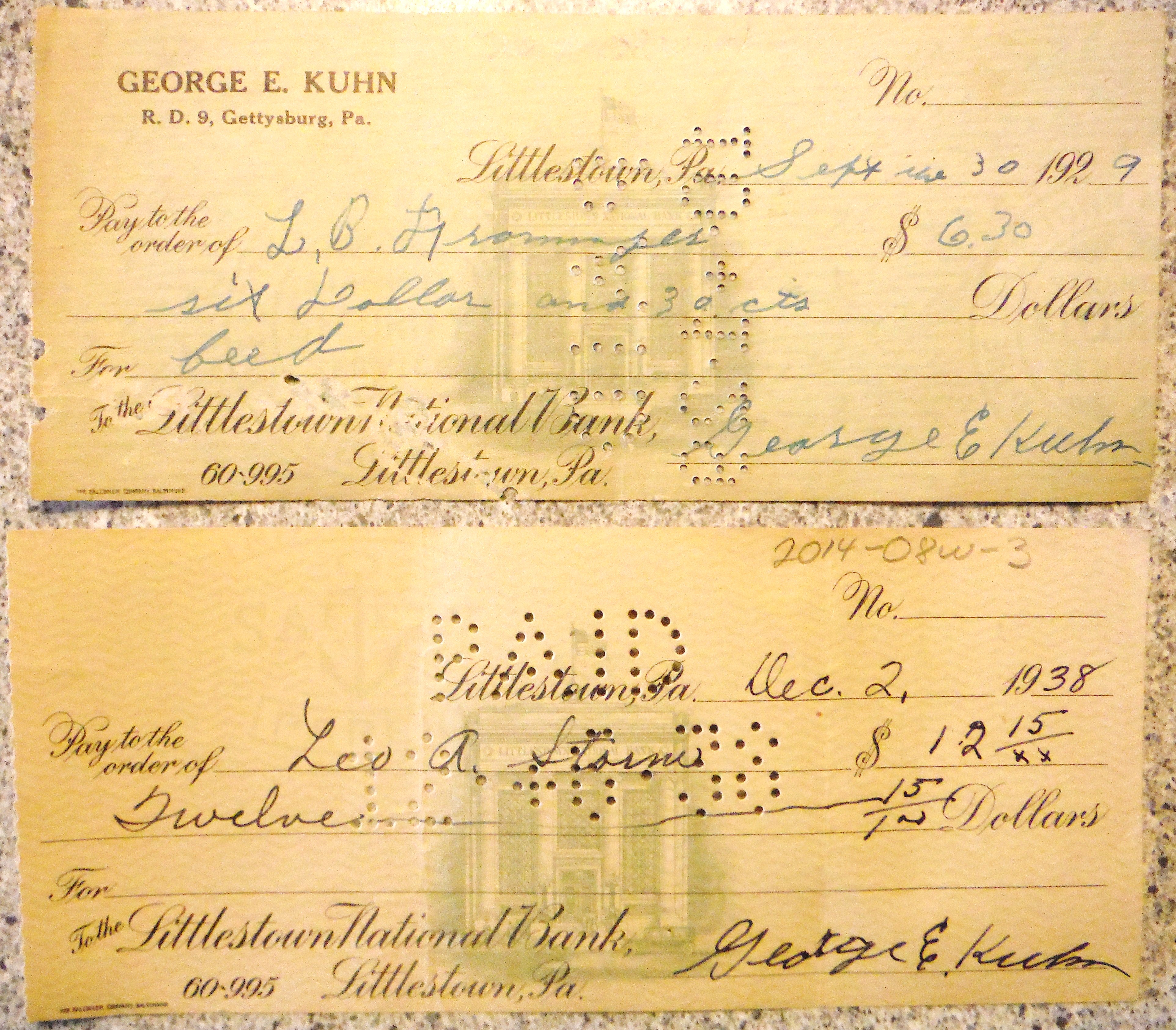 2014-08W-3, Cancelled check; Leo B. Storm feed mill in Bonneauville. The check was written September 30. 1929, at $6.39 for feed. Note that the address of George Kuhn who lived just outside of Bonneauville on the Hunterstown Road was then RD9 Gettysburg, Bonneauville.