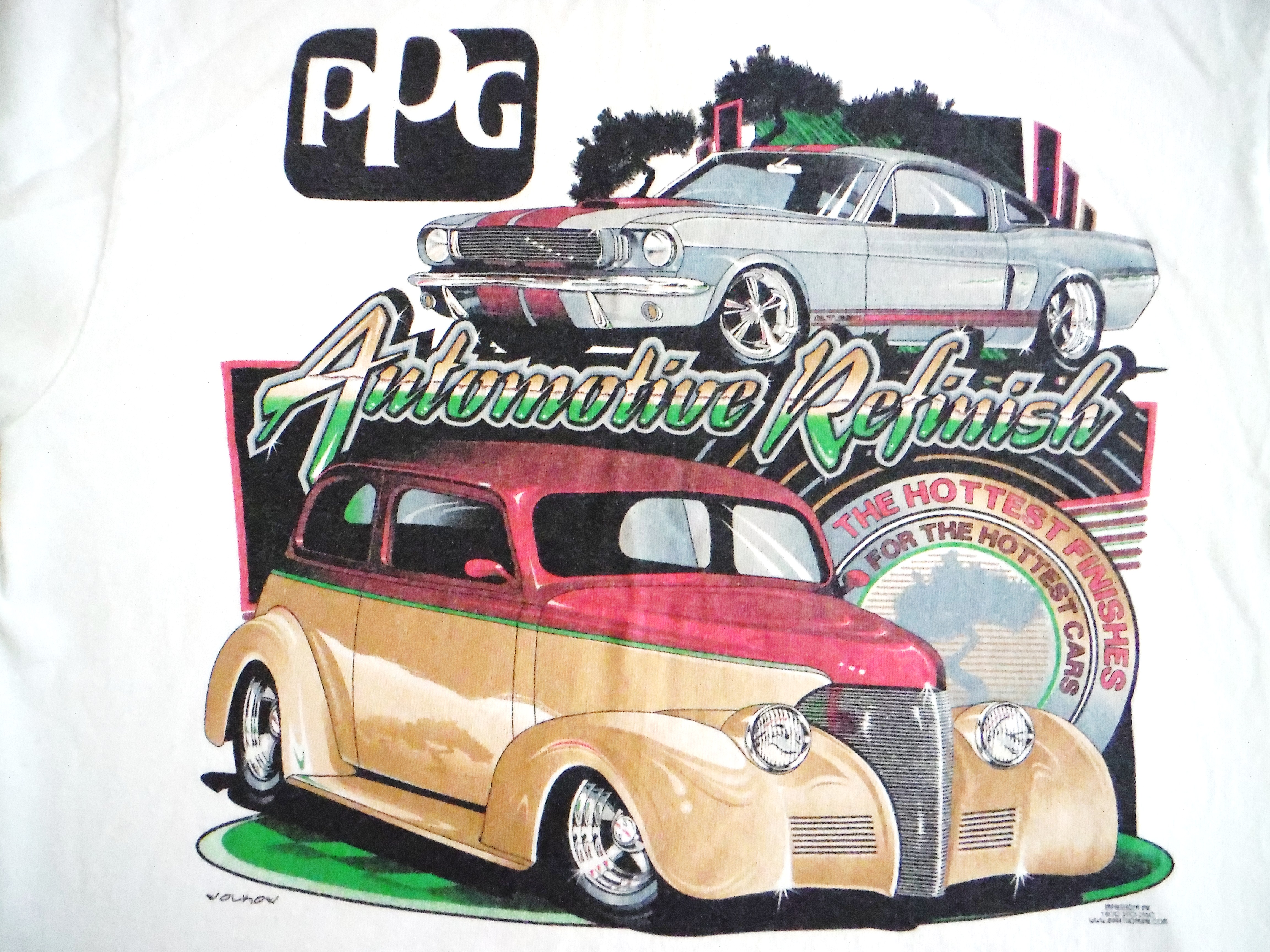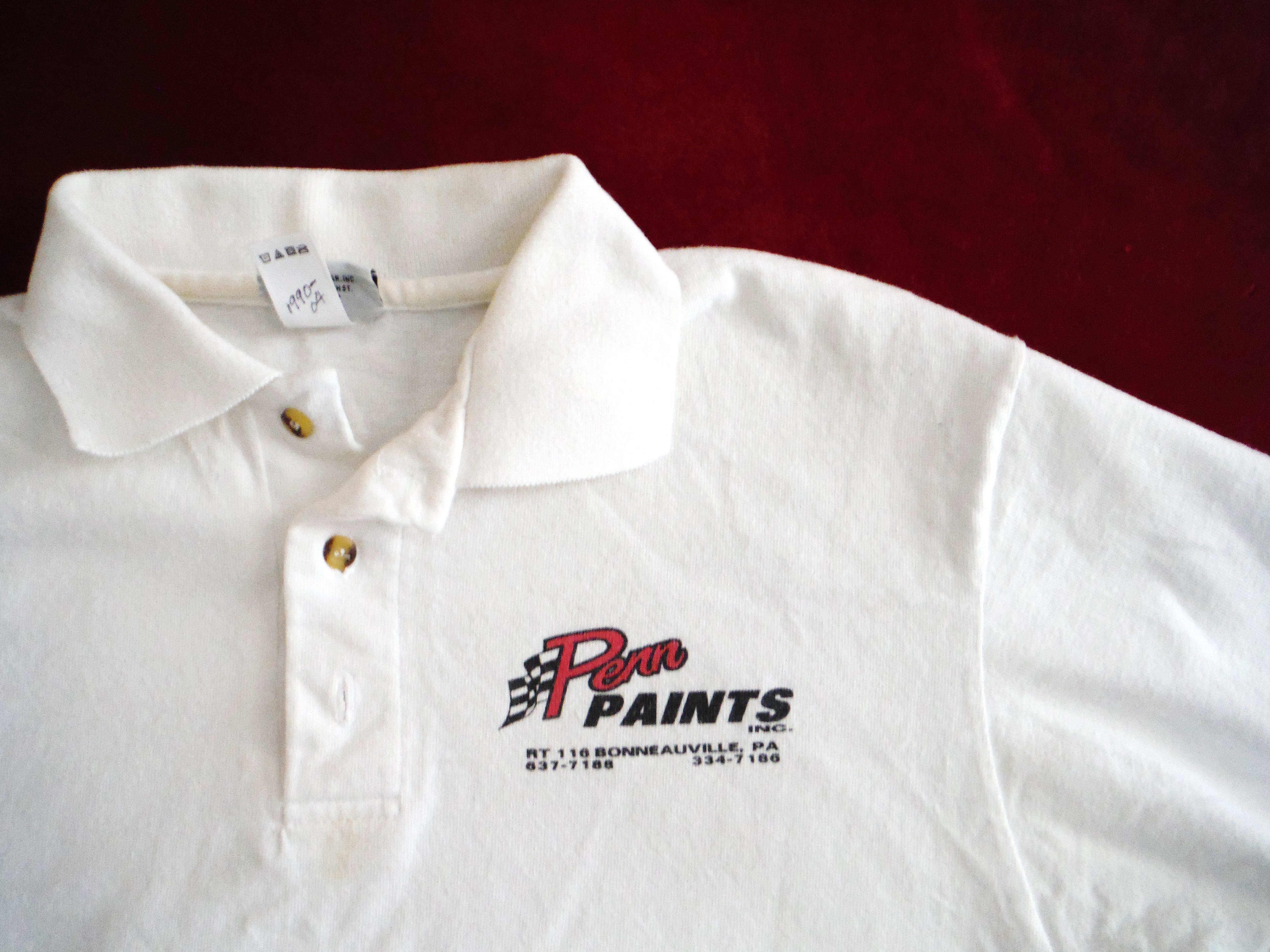 This shirt advertises; "Penn Paints Inc., Rt 116, Bonneauville, PA" (on front) and "PPG, Automotive refinish. The hottest finishes for the hottest cars," (on back). White shirt, multi-colored text and art.