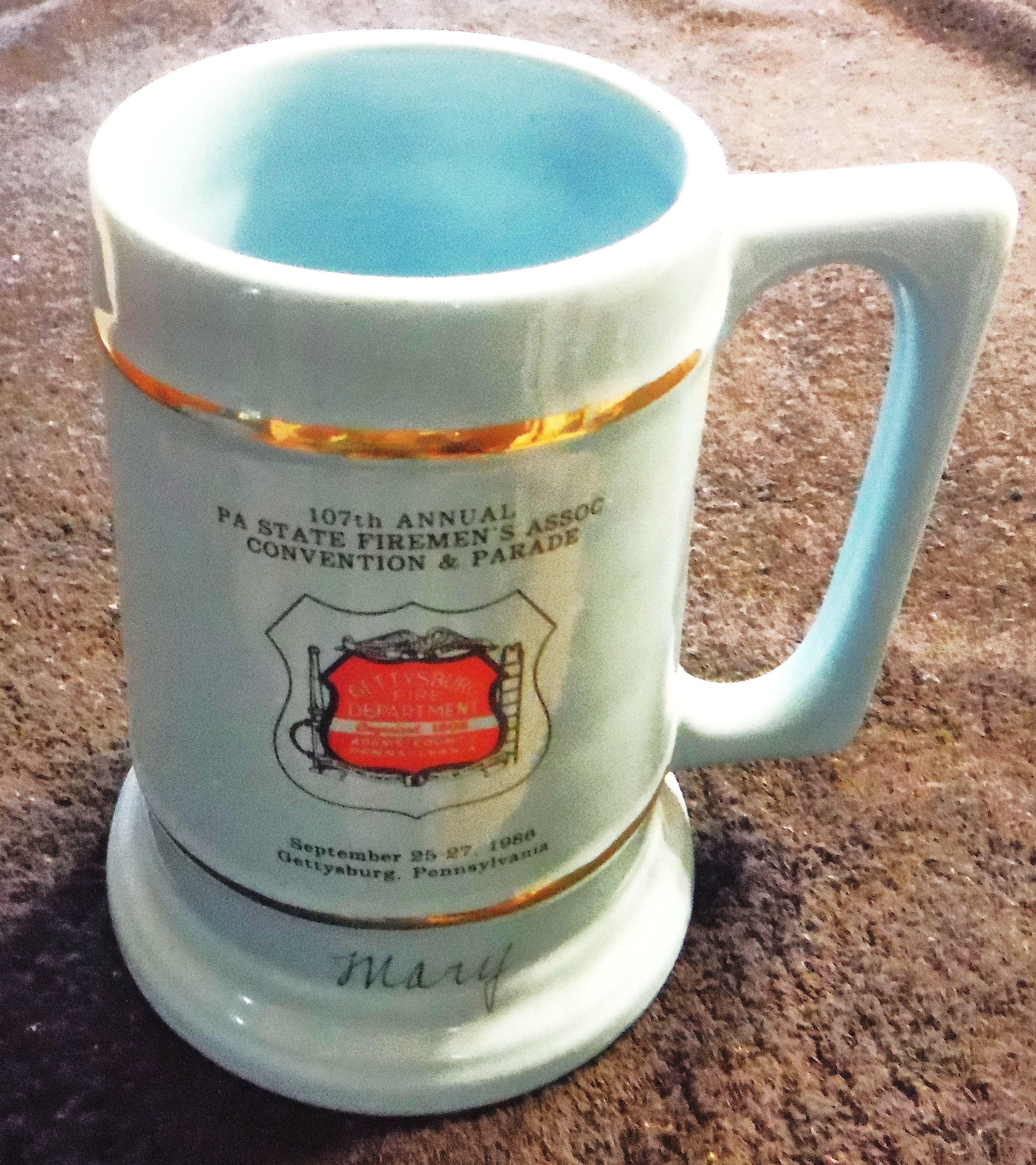 107th Annual PA State Fireman's Convention and Parade. September 25 - 25 1986. Gettysburg, Pennsylvania. Personalized "Mary" in gold. (Mary Esther Kuhn of Bonneauville, PA.)