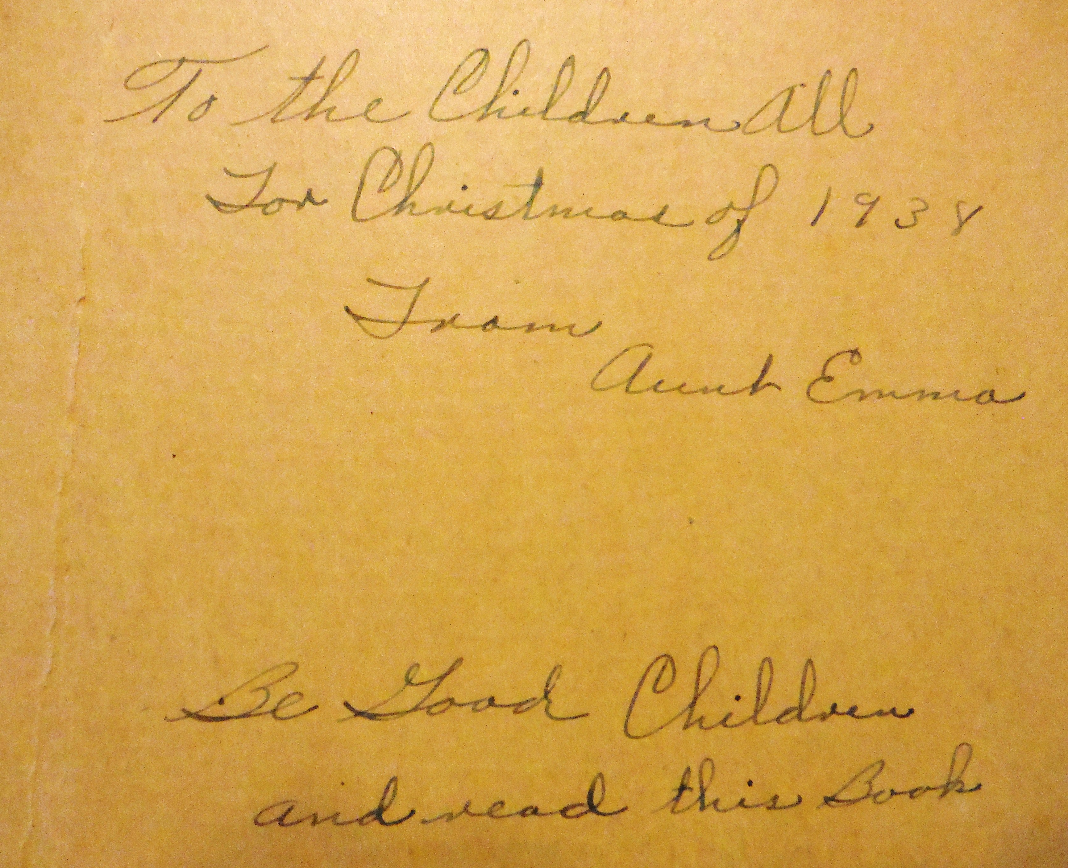 Signed: "To the children all, for Christmas of 1938. From Aunt Emma." "Be good children and read this book."