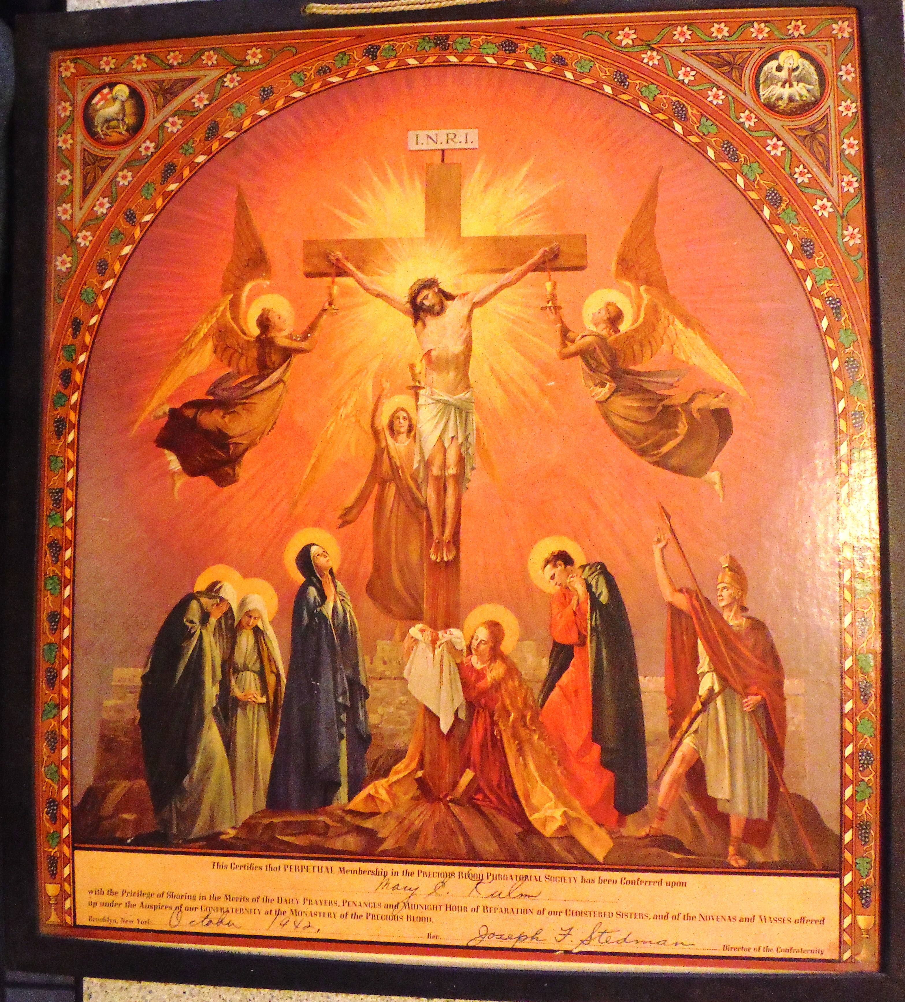 Excellent color depiction of the Crucifixion. Incorporated membership certificate. Mary E. Kuhn, Oct. 1942. Signed; Rec. Joseph F. Stedman. 15" x 16 ½ " black cardboard frame.
