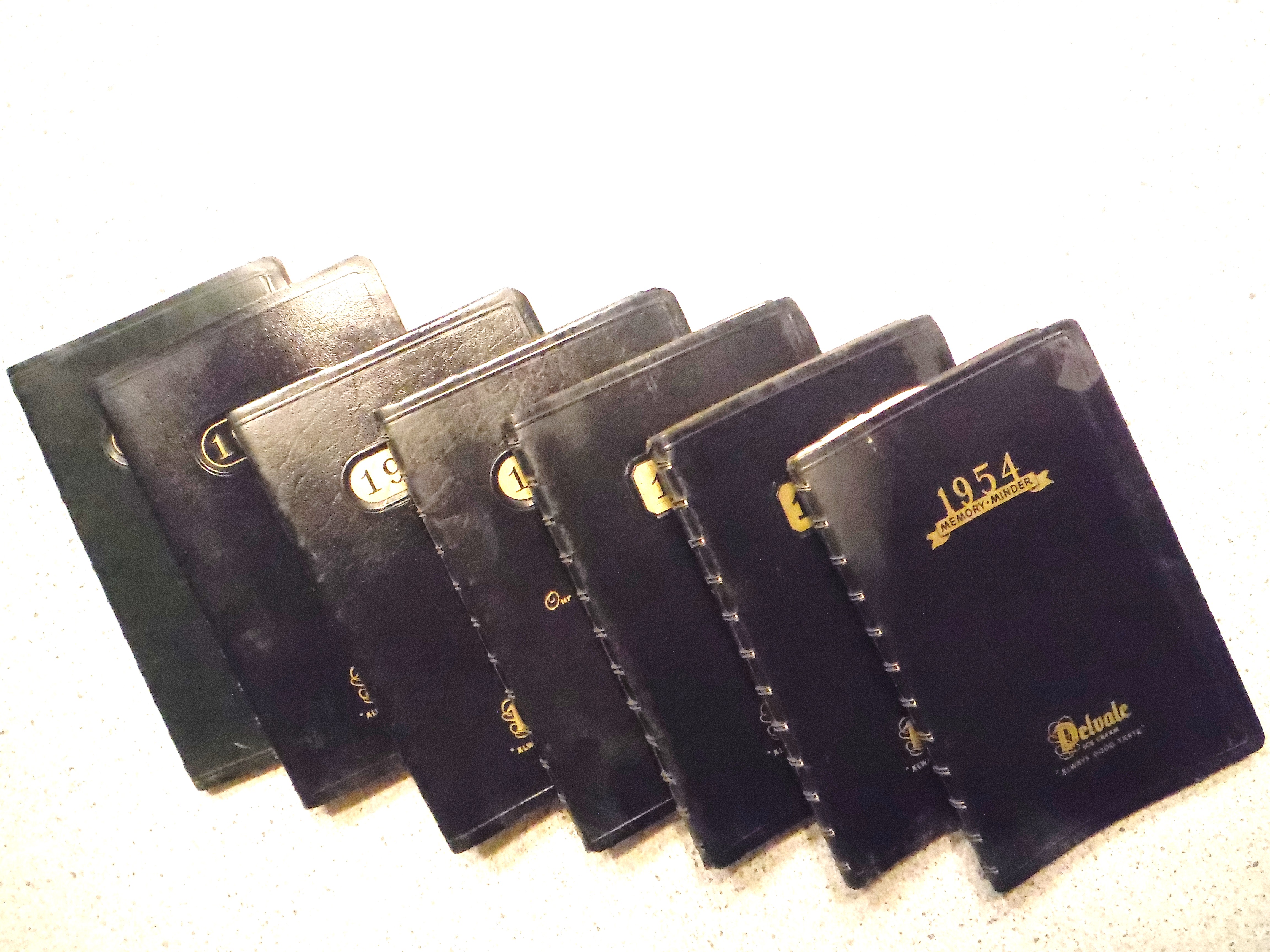 Grouping of seven one-year appointment and memoranda books complements of DeLavle Ice Cream Co. "Always tastes good." Contents: handwritten reminders, notes, lists, mathematics, names, phone numbers etc. by George Kuhn. A revelation of typical farm life during the mid-20th Century.