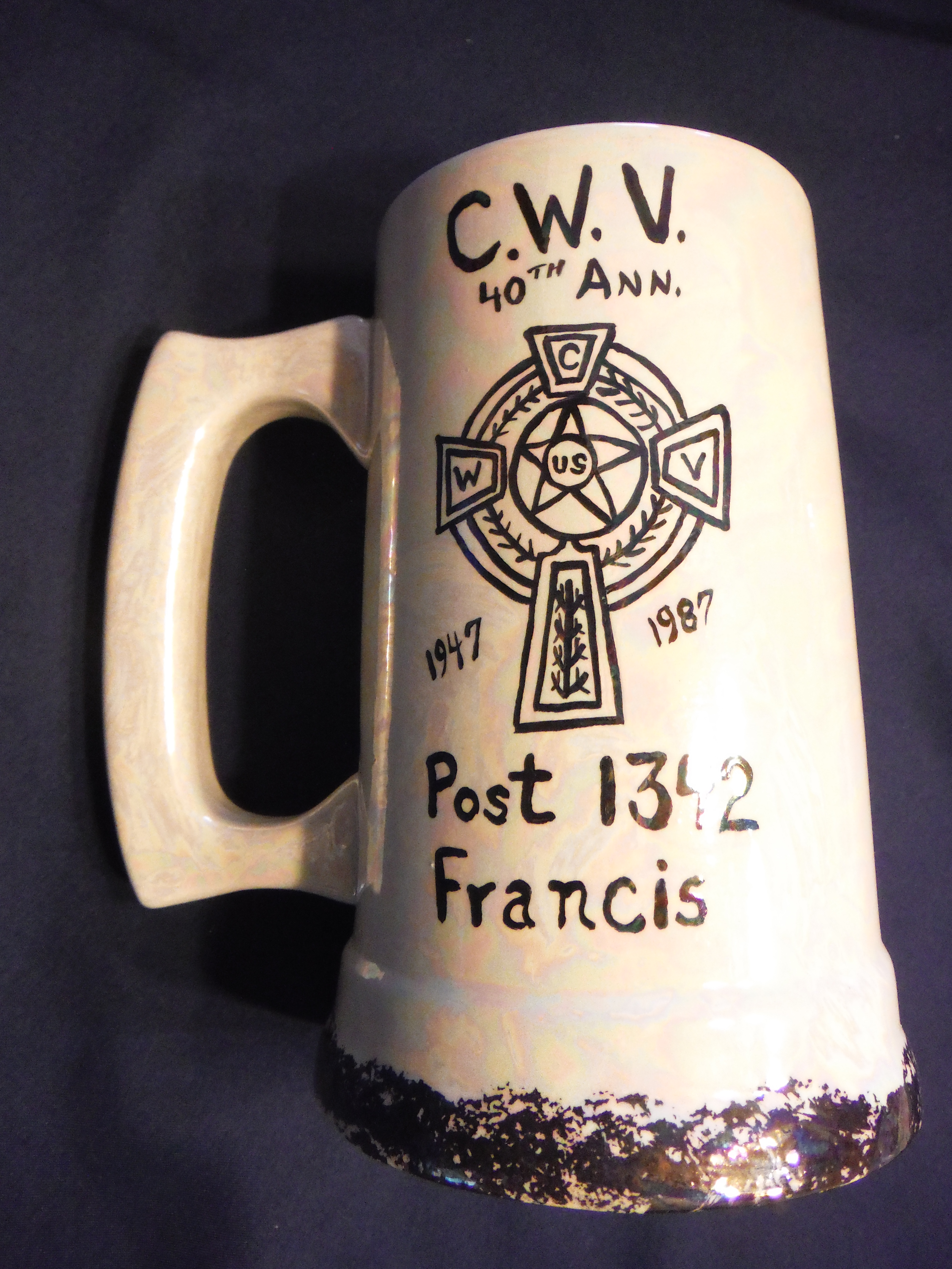 Custom made ceramic stein commemorating Bonneauville Catholic War Veterans 40th Anniversary. Pearlescent white glaze with gold lettering and trim. Text: "C.W.V. , 40th Ann., 1947 - 1987, Post 1342, Francis" (Shanebrook).