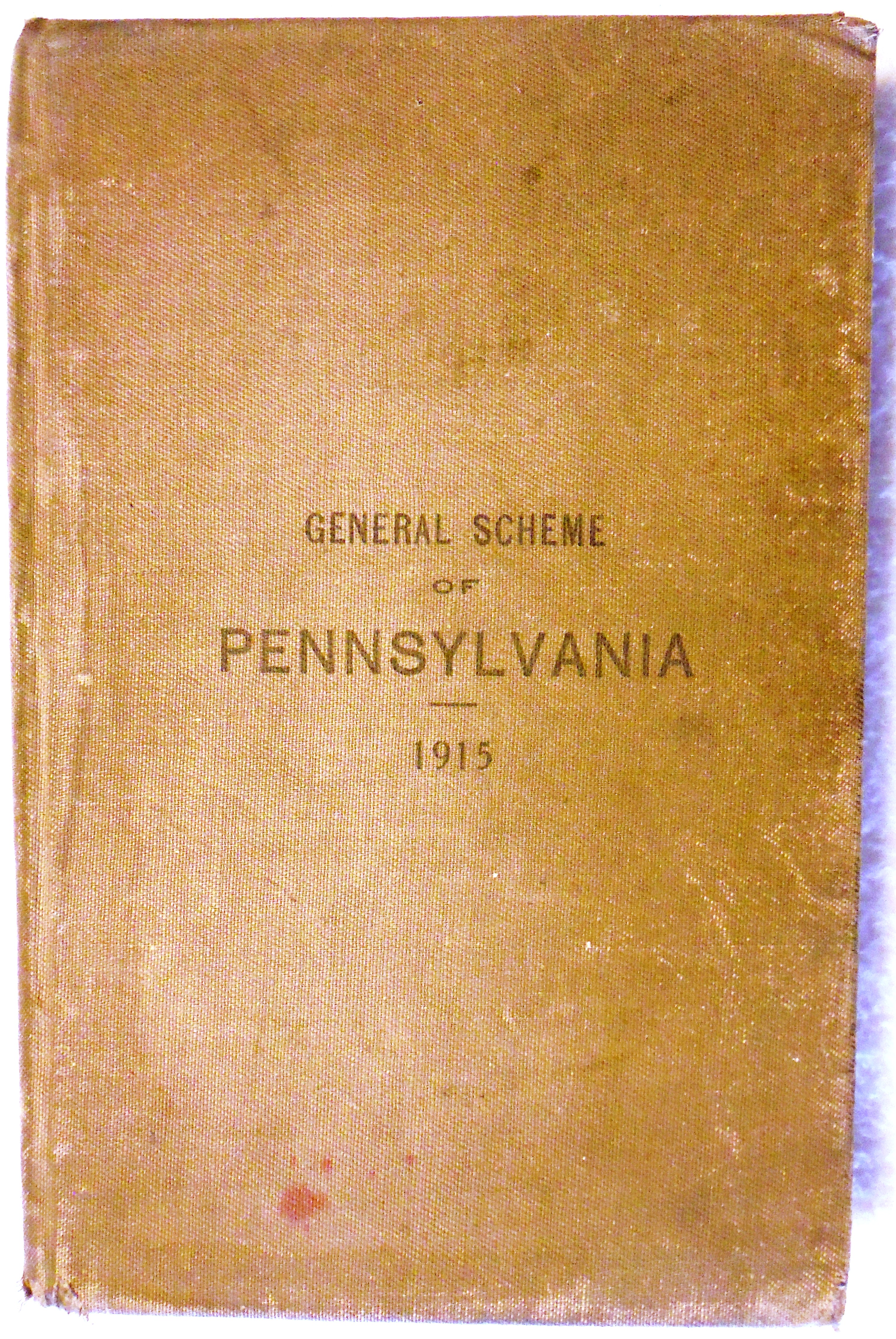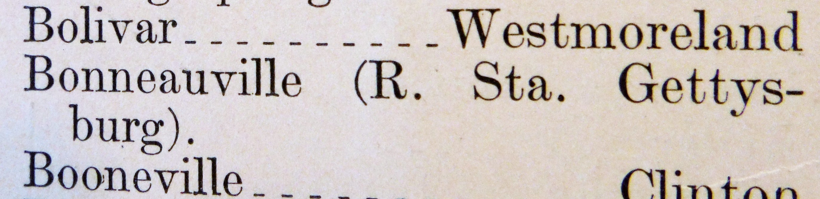 This is a 423 page book issued by the US Post Office Department in 1915. The book lists every post office in Pennsylvania by county. Bonneauville is listed on page VI and on page one, line 12, as a rural station of Gettysburg. The word "out" is penciled beside the town on page one. Every page of the book contains many penciled in changes, names and corrections.