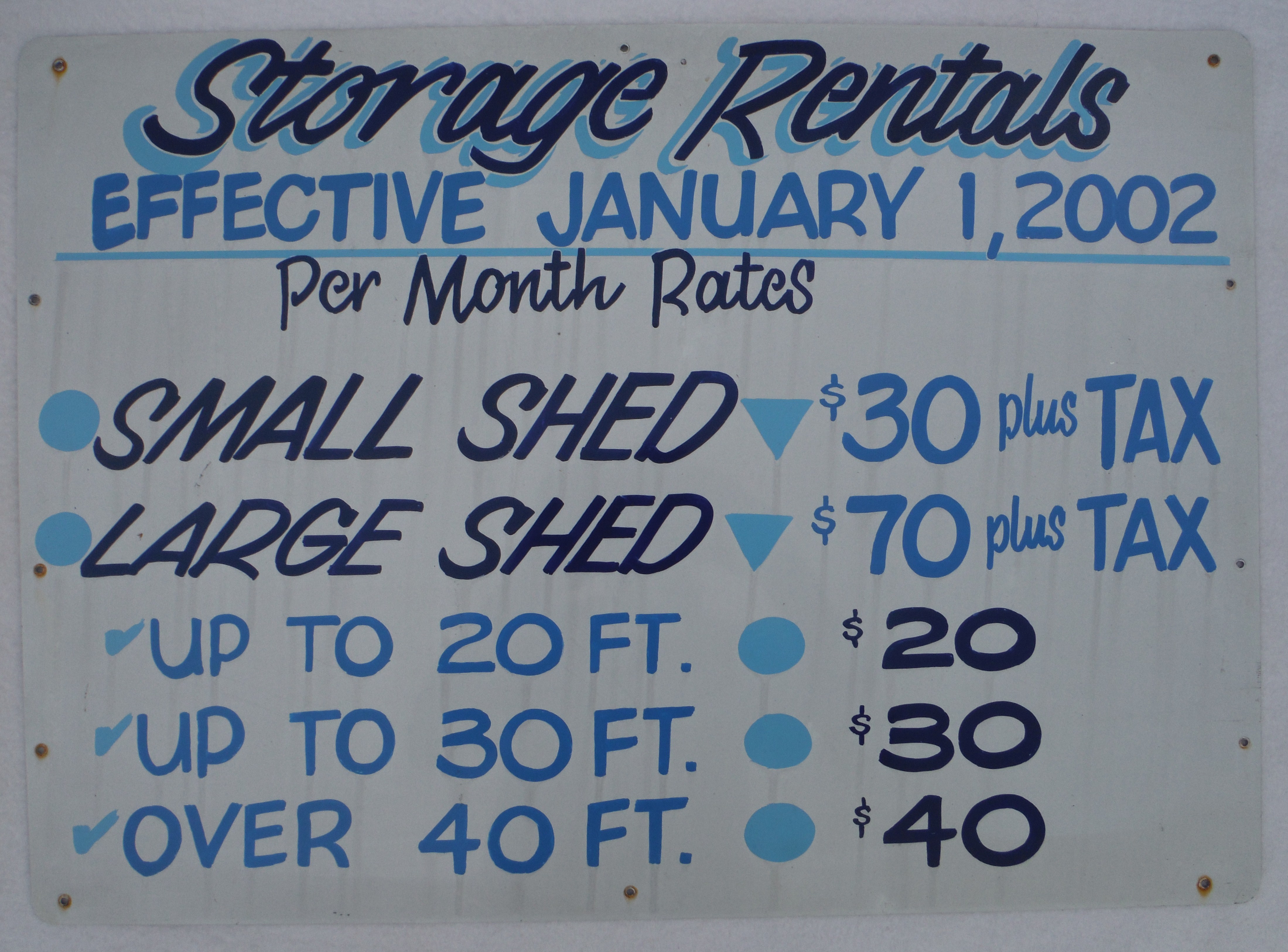 Metal sign from Martins Self Storage facility, Bonneauville, PA; "Effective January 1, 2002," listing storge shed fees.