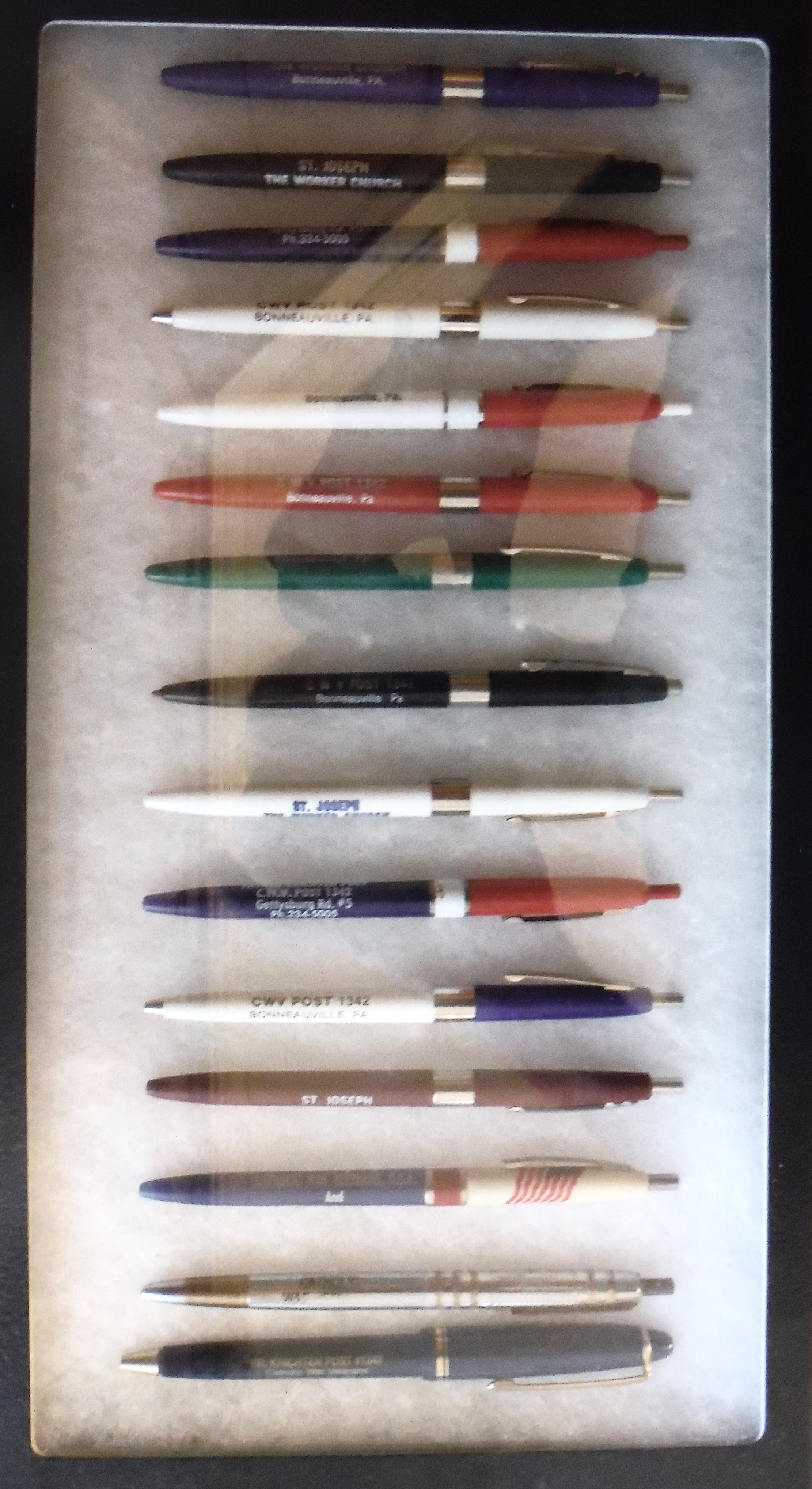 Display case containing fifteen advertising ballpoint pens from various Bonneauville area businesses: St. Joseph the Worker Church, Catholic War Veterans, Fr. Krichten Post, Ladies Auxiliary.