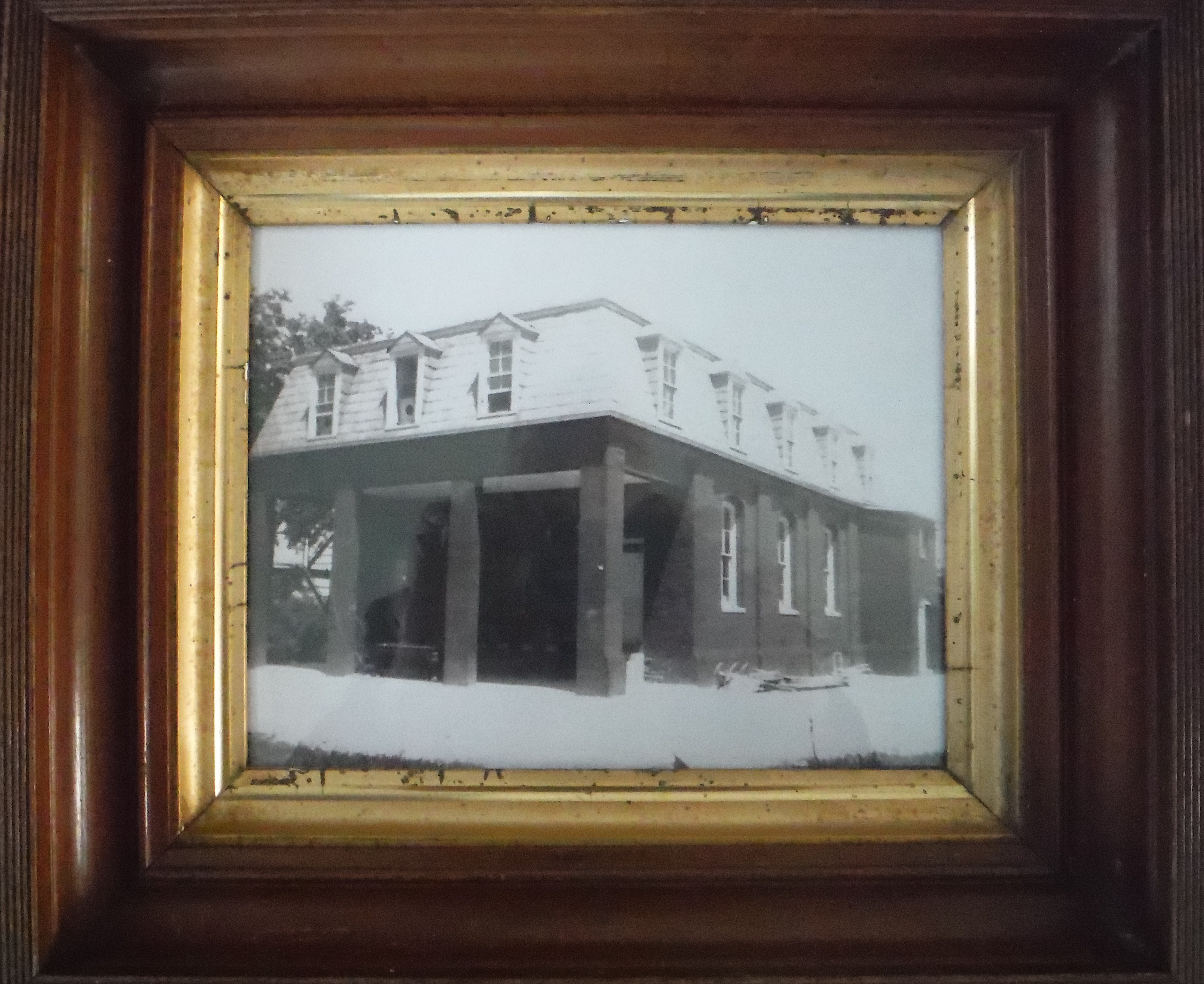 Framed black and white photograph of Saint Joseph's School in Bonneauville, PA. This building on East Hanover Street fronts the more modern St. Joseph's School (now Deacon Weaver Parish Center). Built about 1959, the early school building has long been referred to by Bonneauvillians as "The Old School." The old school alternated as a public and parochial school as time, economic conditions, Catholic population and other factors dictated. In 1939 the facility was changed from a Public to a Catholic School. In preparation for making the switch the large open area at the rear of the building was enclosed with brick. Four downstairs classrooms were changed to an auditorium. The newly bricked area housed the stage. The horizontal lines at the rear of the building that appear to be siding on a nearby building are steel fire escape steps from the second floor. There appears to be a pool table (perhaps a grand style piano) under the overhang. This photograph was taken about 1938.