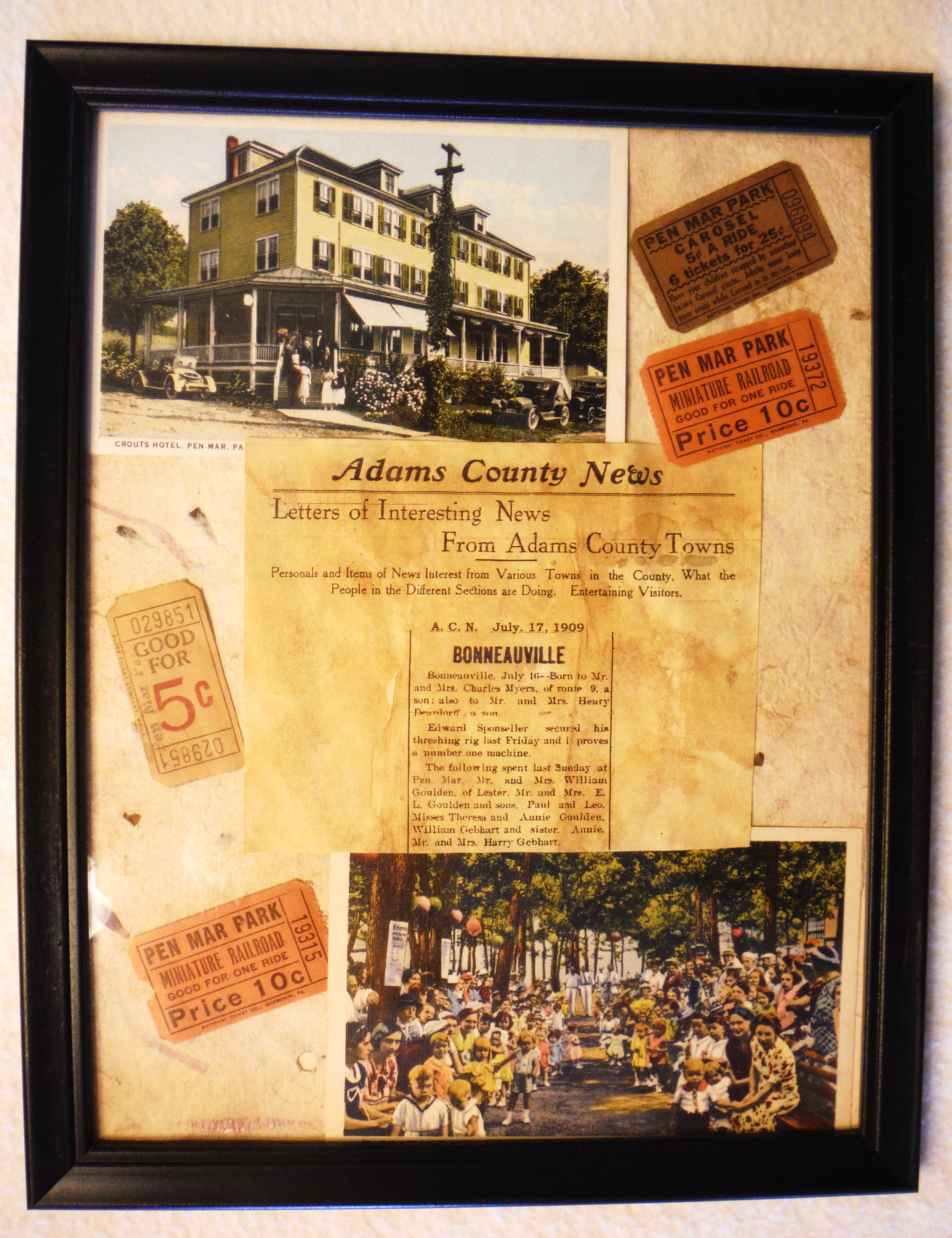 For residents of Bonneauville, the park was a desirable mini-vacation destination. It was a treat for Bonneauville families to be able to take the train from Gettysburg to Pen Mar park on a Saturday or Sunday. It was a social event worthy of newspaper mentioning. In this framed collage a newspaper notes: ". . . The following spent last Sunday at Pen Mar: Mr. and Mrs. William Golden of Lester. Mr. and Mrs. E. L. Golden and sons, Paul and Leo, Misses Theresa and Annie Golden. (The Bonneauville Blue Ribbon Cigar Golden's), William Gebhart and sister Annie, Mr. and Mrs. Harry Gebhart. Included in the collage are two Pen Mar postcards and four ride ticket stubs.