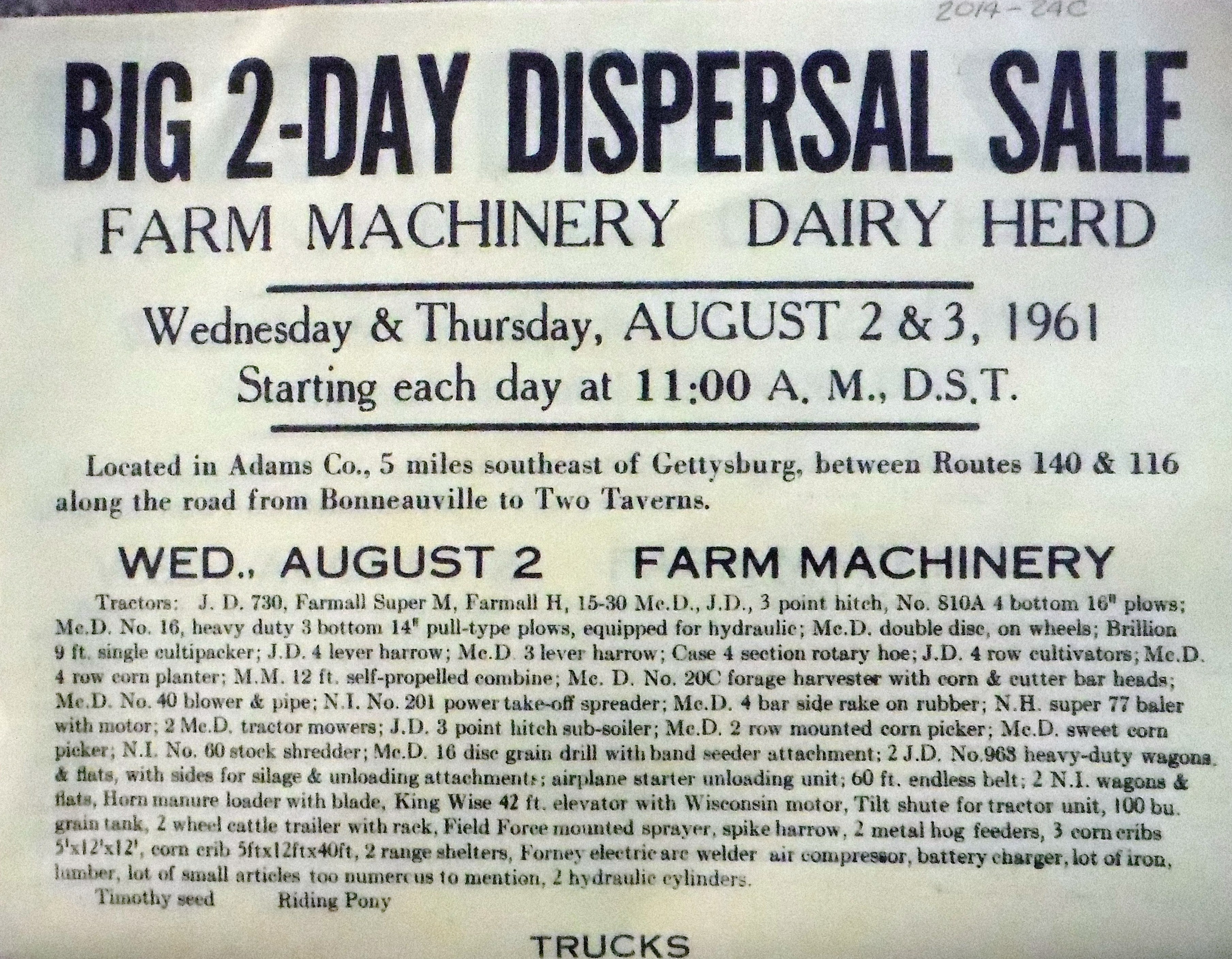 Until 1961, Kenneth U. Appler farmed on the Two Taverns Road just south of Bonneauville. It took two days of auction selling to liquidate the farm machinery and dairy herd he had gathered during his farming career. Everything from Farmall tractors to a riding pony and a 1952 Ford truck to a young bull sired by "Harden Duke," was sold.