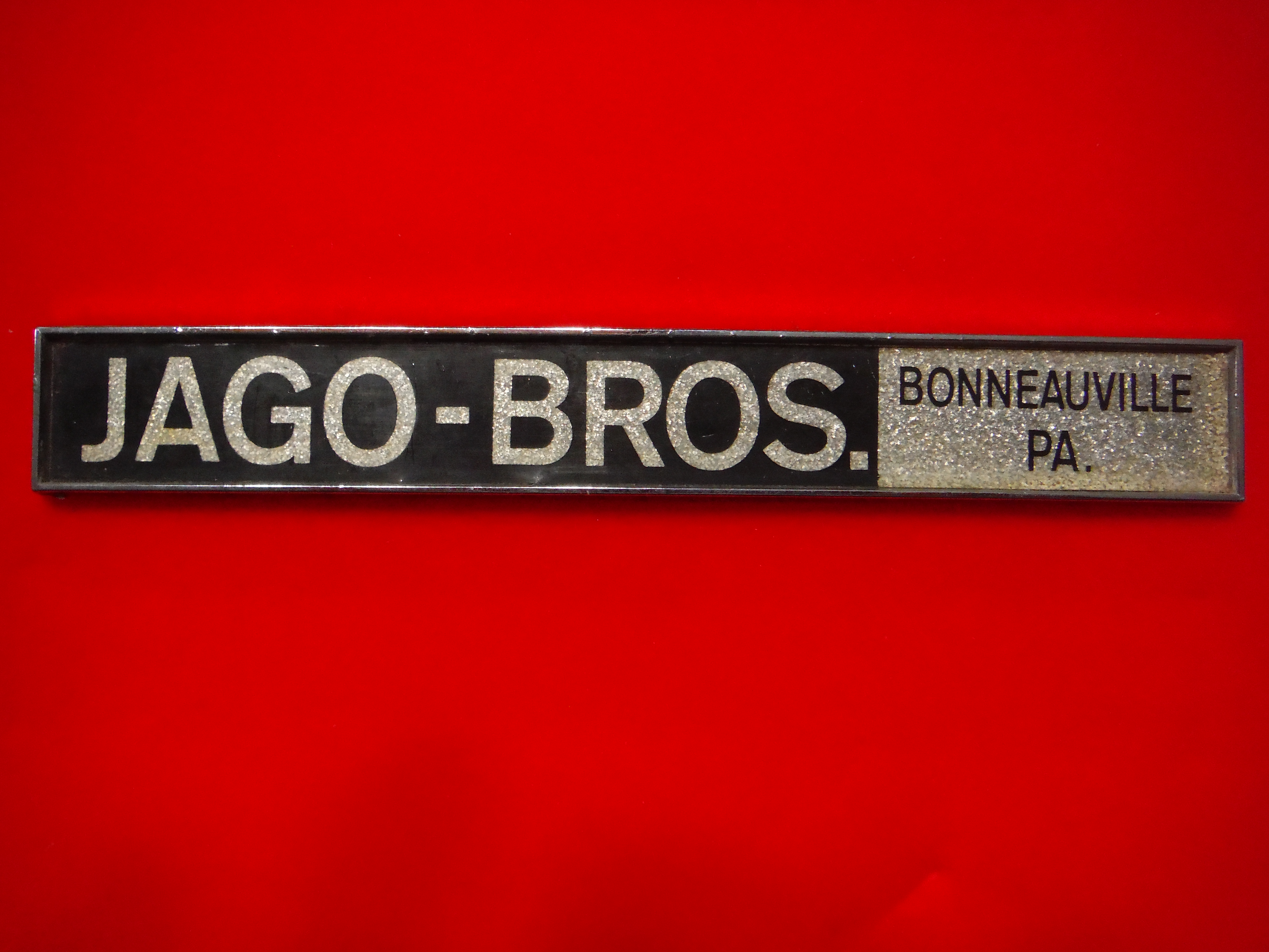 This chrome and black "Jago - Bros. Bonneauville, PA." emblem was one of many placed on the rear of Jago's used cars. Their car lot was located on East Hanover Street in Bonneauville, PA. The Jago's specialized in Cadillacs but also sold other makes of vehicles. This item is thought to be an early 1970's version of the Jago Bros. Emblem.
