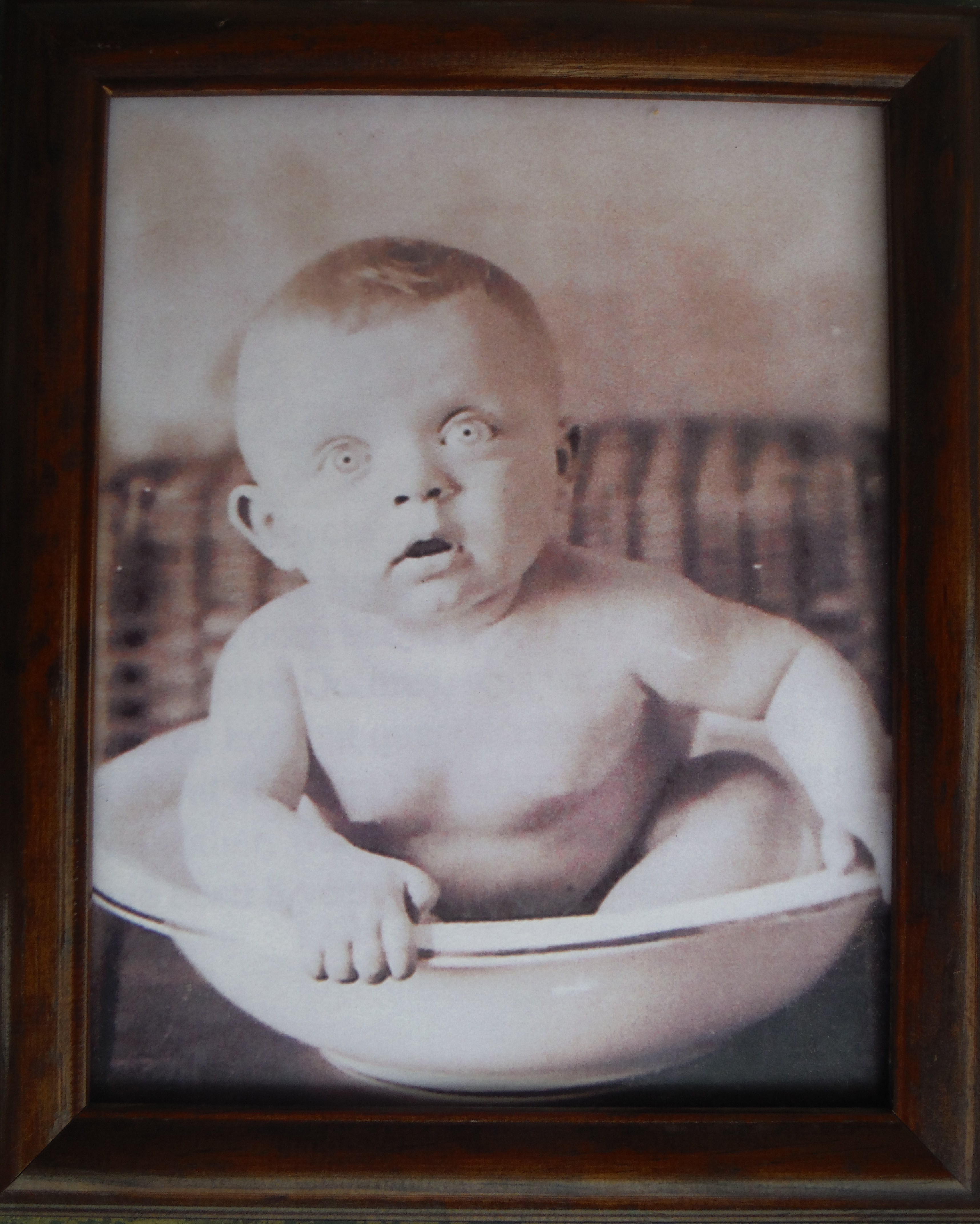 This remarkable photograph is of infant Vincent Staub of Bonneauville, PA. Mr. Staub was sturdy and short of stature. He must have been smaller than the average infant. This framed photograph, enlarged from a "real photo postcard," shows him comfortably sitting naked in a ceramic washbowl.