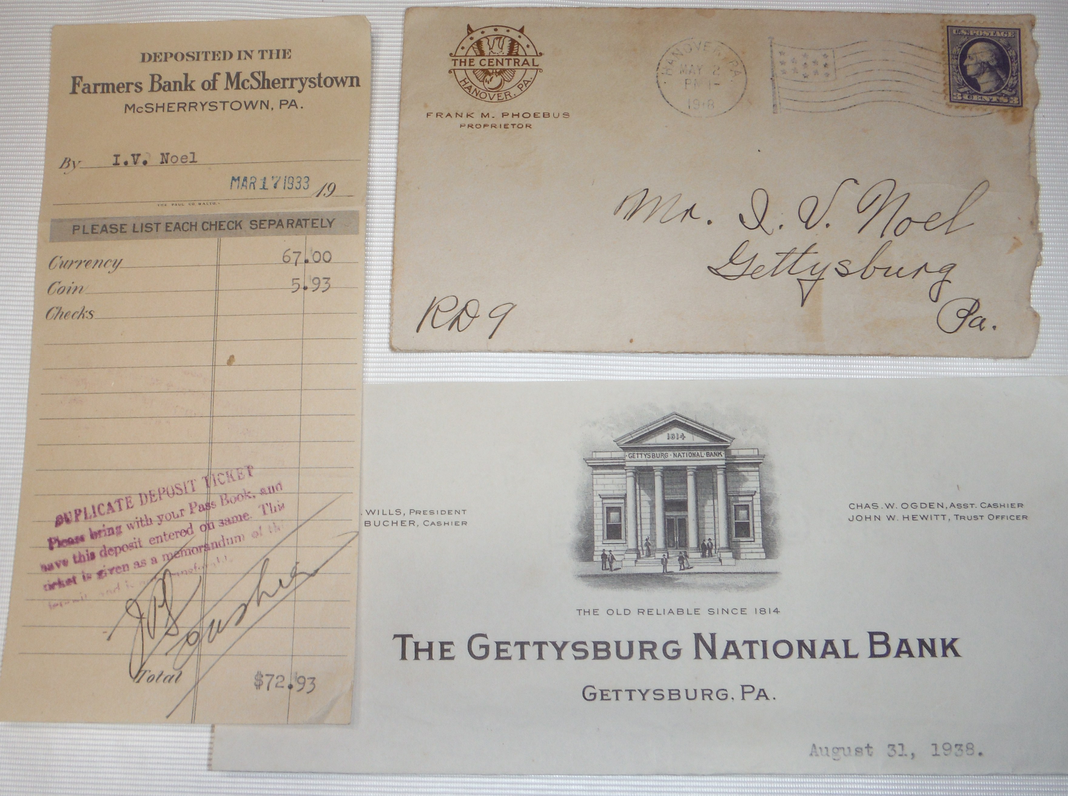 Ephemera representing the Gettysburg National Bank, Farmers Bank Of McSherrystown, and the Central Bank of Hanover.