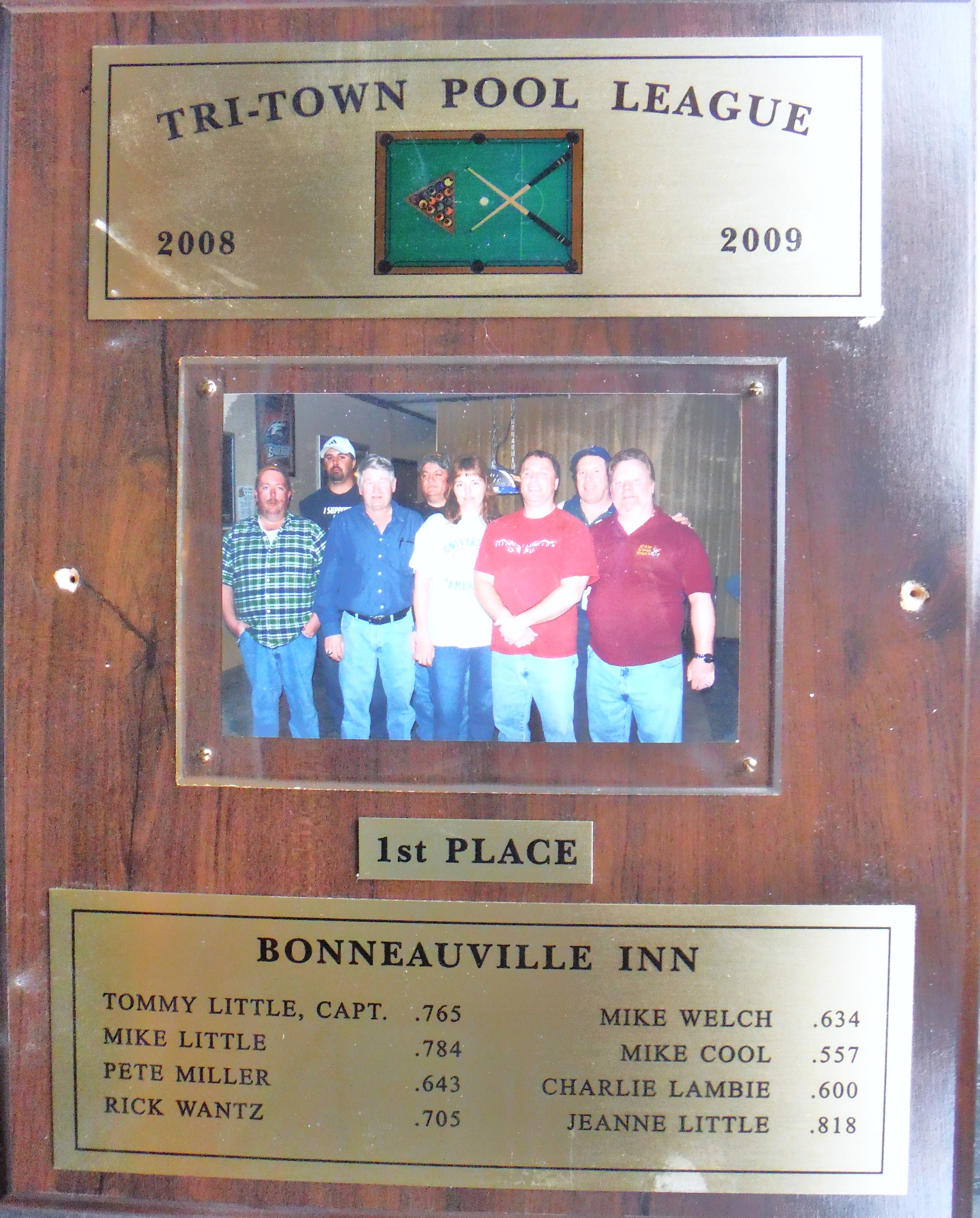 This plaque awards 2008-2009 first place to the Tri-Town Pool League at the Bonneauville Inn.
