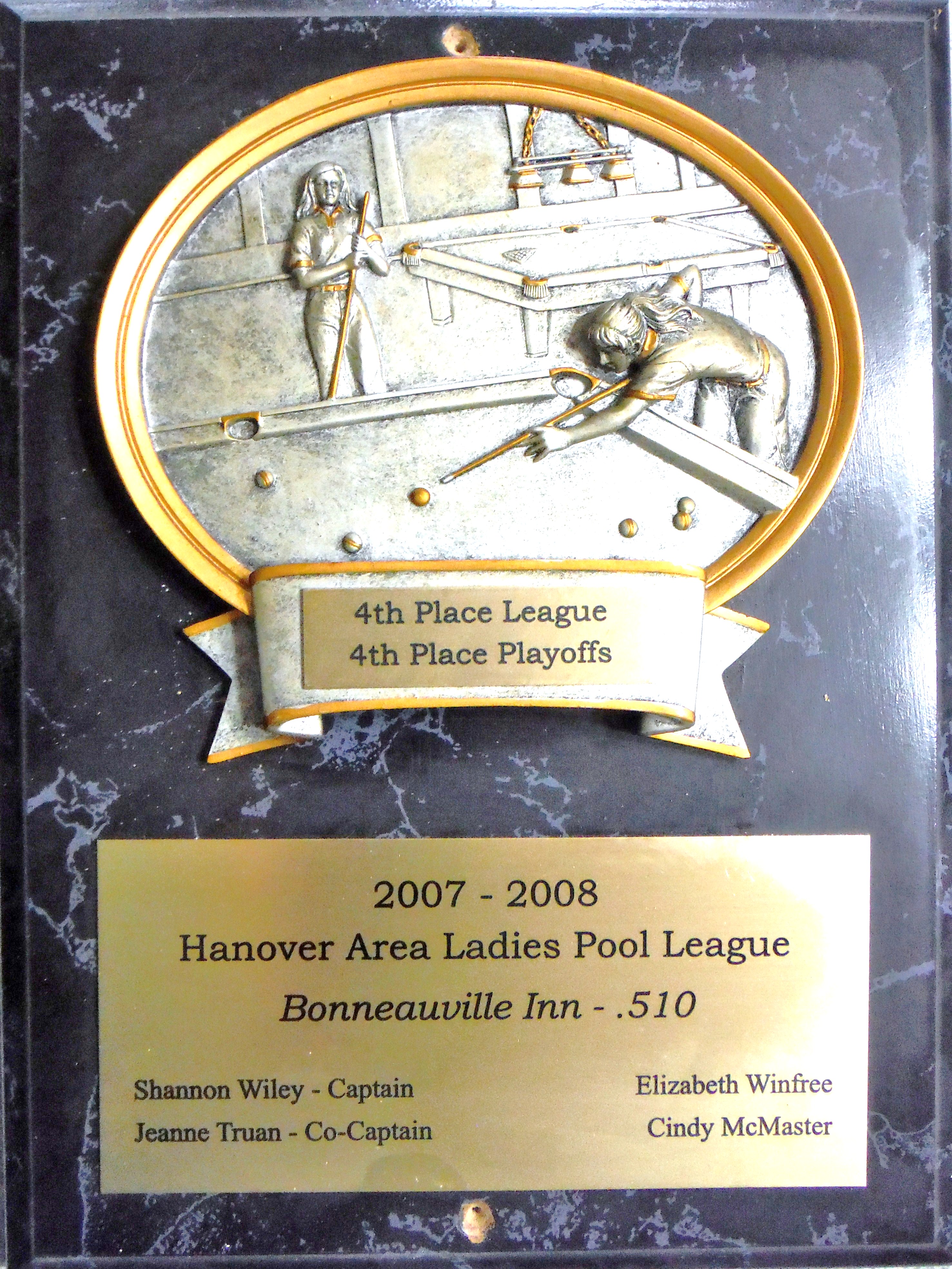 This plaque awards 2007-2008 4th place to the Hanover Area Ladies Pool League at the Bonneauville Inn.