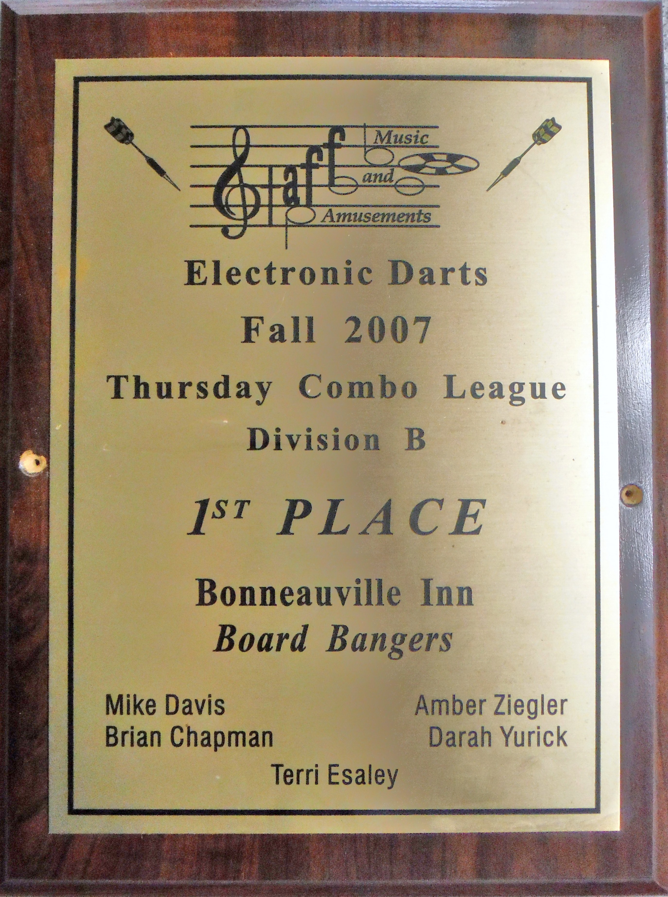This plaque awards 2007 Electronic Darts 1st place to the Board Rangers at the Bonneauville Inn.
