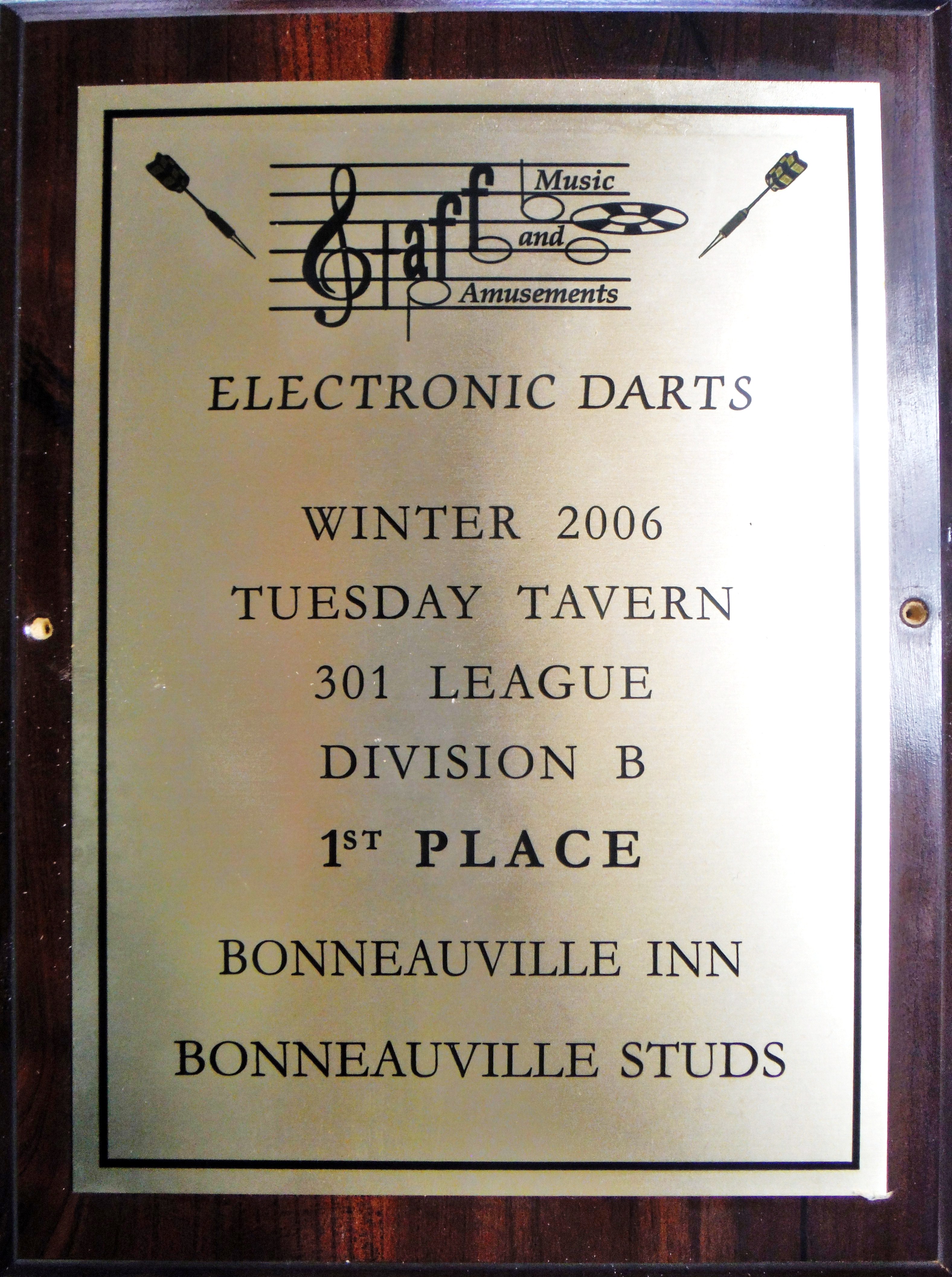 This plaque awards 2006 Electronic Darts 1st place to the "Boneauville Studs" at the Bonneauville Inn.