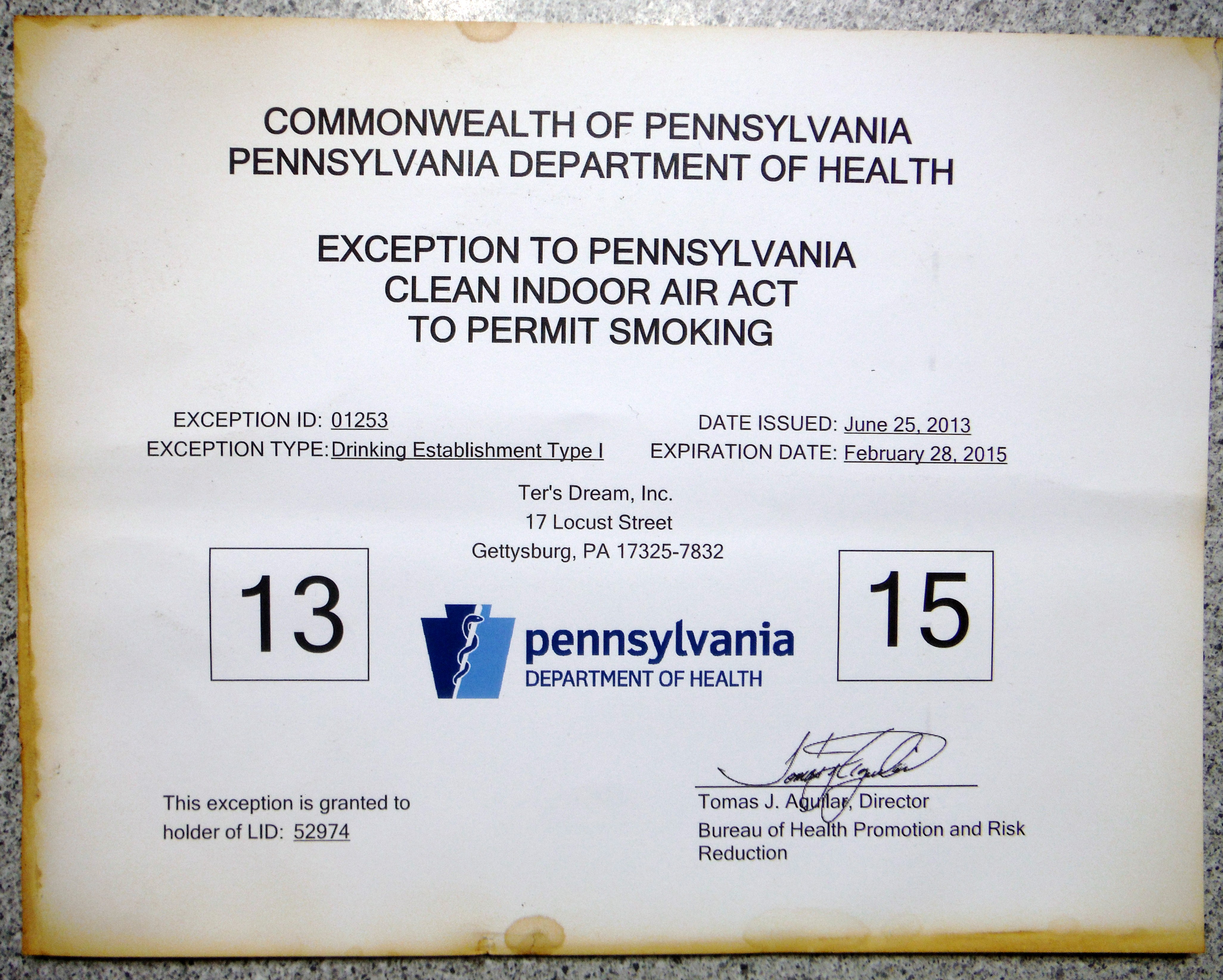 Commonwealth of Pennsylvania, Pa Dept. of Health, Exception to PA Clean Indoor Air Act to Permit Smoking. Issue date: June 25, 2013. Issued to the Bonneauville Inn.