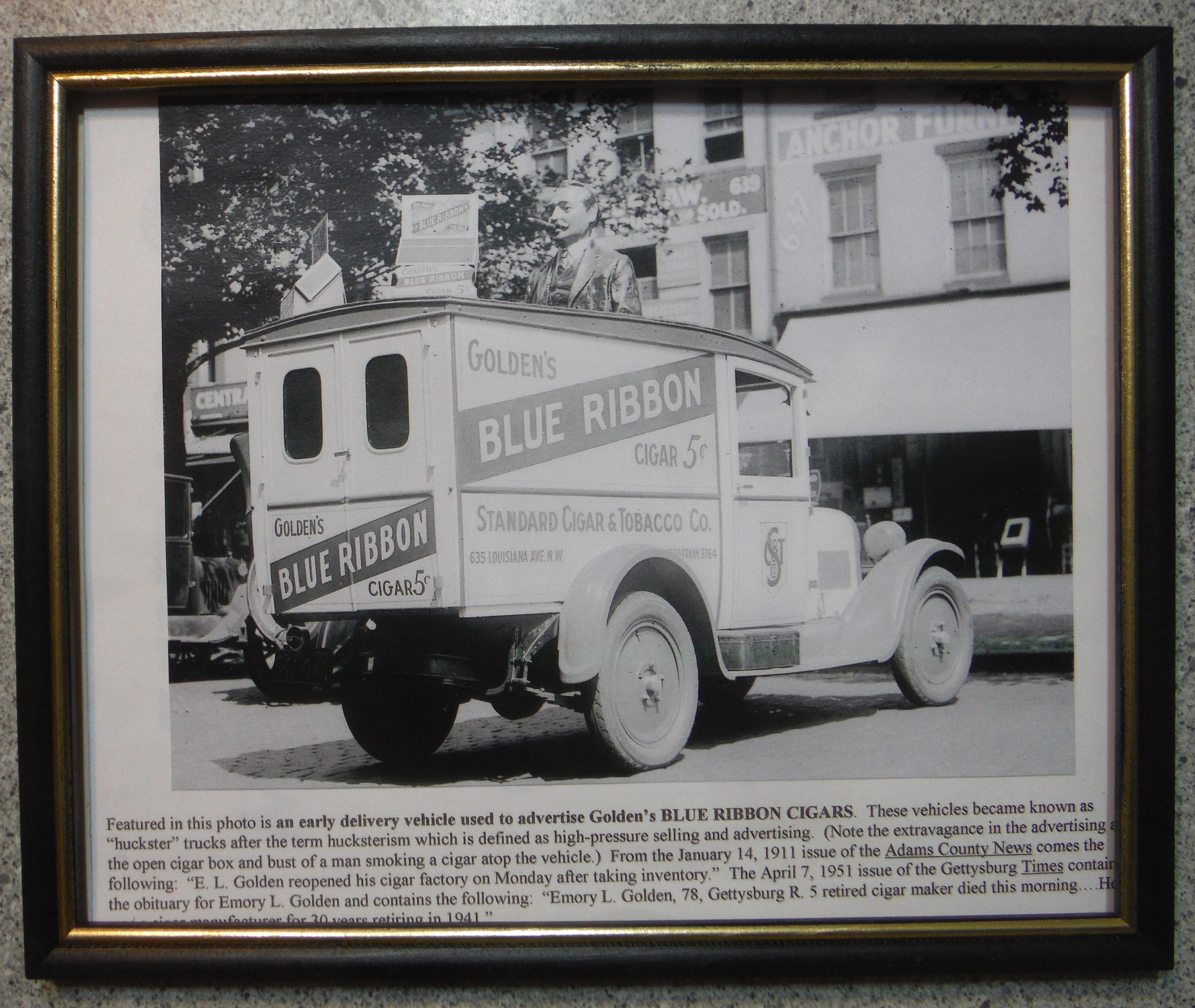"Featured in this photo is an early delivery vehicle used to advertise Golden's Blue Ribbon Cigars. These vehicles became known as huckster trucks after the term hucksterism which is defined as high-pressure selling and advertising. (Note the extravagance in the advertising as the open cigar box and bust of a man smoking a cigar atop the vehicle.) From the January 14, 1911 issue of the Adams County News comes the following: E. L. Golden reopened his cigar factory on Monday after taking inventory. The April 7, 1951 issue of the Gettysburg Times contains the obituary for Emory L. Golden and contains the following: Emory L. Golden 78, Gettysburg R. 5 retired cigar maker, died this morning. He was a cigar manufacturer for 30 years retiring in 1941."