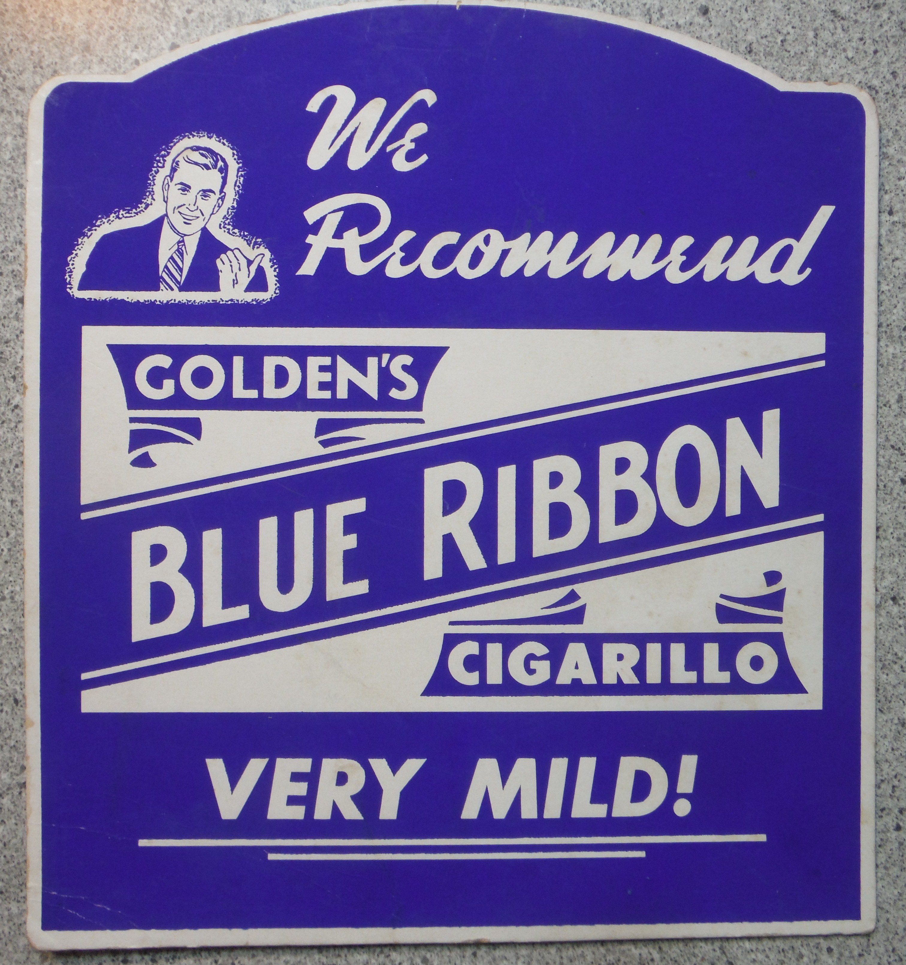 This Golden's Blue Ribbon Cigar counter display measures 10" x 11". It represents the aggressive approach that the Goldens used to promote their most popular brand of cigars. The one color graphics printing style was economical but yet vivid and attractive.